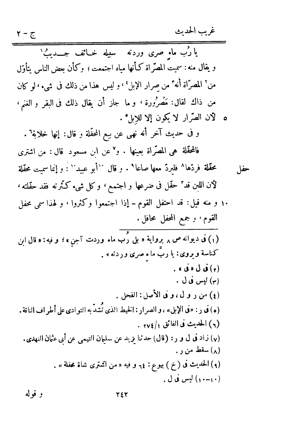 وَيُقَال مِنْهُ: سميت الْمُصراة كَأَنَّهَا مياه اجْتمعت وَكَأن بعض النَّاس يتأوّل من الْمُصراة أَنه من صِرار الْإِبِل وَلَيْسَ هَذَا من ذَلِك فِي شَيْء لَو كَانَ من ذَاك لقَالَ: مَصْرُورة وَمَا جَازَ أَن يُقَال ذَلِك فِي الْبَقر وَالْغنم لِأَن الصرار لَا يكون إِلَّا لِلْإِبِلِ. وَفِي حَدِيث آخر أَنه نهى عَن بيع المحفّلة وَقَالَ: إِنَّهَا خلابة. فالمحفّلة هِيَ الْمُصراة بِعَينهَا. وعَن ابْن مَسْعُود قَالَ: من اشْترى محفّلة فردّها فليردّ مَعهَا صَاعا.
