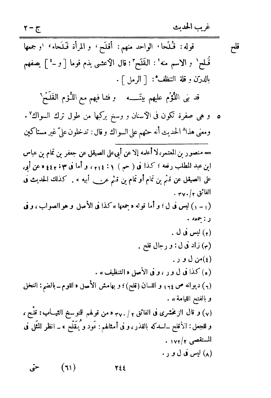 قَوْله: قُلْحا الْوَاحِد مِنْهُم: أقلَح وَالْمَرْأَة قَلحاء وَجَمعهَا قُلح وَالِاسْم مِنْهُ: القَلَح قَالَ الْأَعْشَى يذم قوما [و -] يصفهم بالدرن وَقلة التنظف: [الرمل] . ... قد بنى اللُّؤْم عَلَيْهِم بيتَه ... وَفَشَا فيهم مَعَ اللُّؤم القَلَحْ