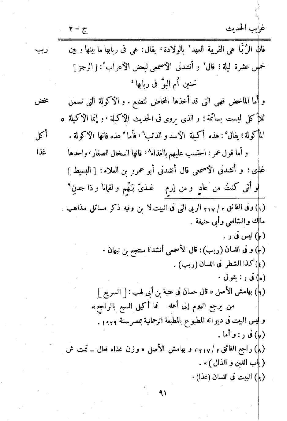 وَأما الماخض فَهِيَ الَّتِي قد أَخذهَا الْمَخَاض لتَضَع. والأكولة الَّتِي تسمن للْأَكْل لَيست بسائمة وَالَّذِي يروي فِي الحَدِيث الأكيلة وَإِنَّمَا الأكيلة المأكولة يُقَال: هَذِه أكيلة الْأسد وَالذِّئْب فَأَما هَذِه فَإِنَّهَا الأكولة. وَأما قَول عمر: احتسب عَلَيْهِم بالغذاء فَإِنَّهَا السخال الصغار وَاحِدهَا غذي وأنشدني الْأَصْمَعِي قَالَ أَنْشدني أَبُو عَمْرو بْن الْعَلَاء: [الْبَسِيط]