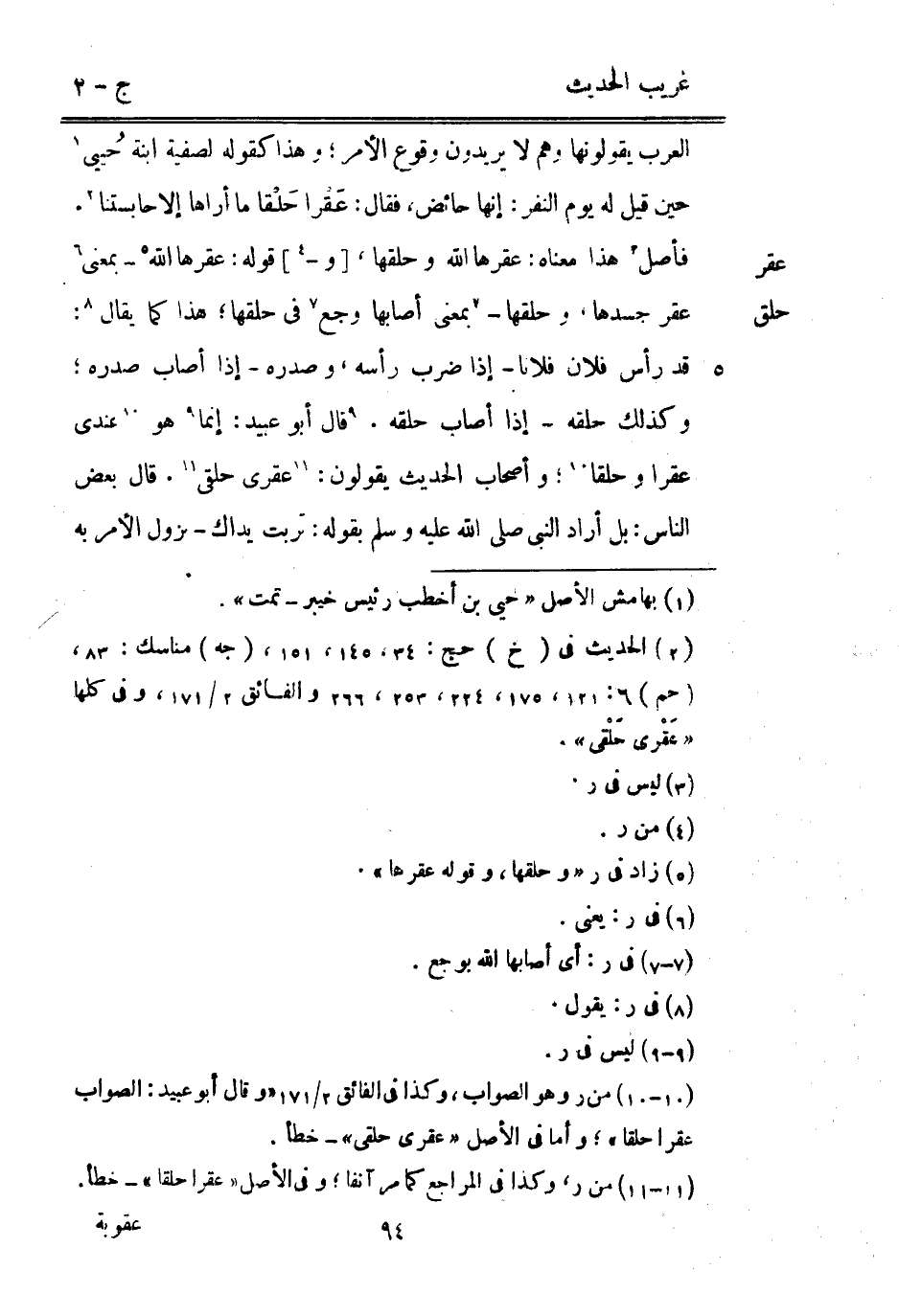 العري يَقُولُونَهَا وهم لَا يُرِيدُونَ وُقُوع الْأَمر وَهَذَا كَقَوْلِه لصفية ابْنة حُيي حِين قيل لَهُ يَوْم النَّفر: إِنَّهَا حَائِض فَقَالَ: عَقْرا حَلْقا مَا أَرَاهَا إِلَّا حابستنا. فَأصل هَذَا مَعْنَاهُ: عقرهَا اللَّه وحلقها [و -] قَوْله: عقرهَا اللَّه بِمَعْنى عقر جَسدهَا وحلقها بِمَعْنى أَصَابَهَا وجع فِي حلقها هَذَا كَمَا يُقَال: قد رَأس فلَان فلَانا إِذا ضرب رَأسه وصدره إِذا أصَاب صَدره وَكَذَلِكَ حلقه إِذا أصَاب حلقه. قَالَ أَبُو عُبَيْدٍ: إِنَّمَا هُوَ عِنْدِي عقرا وحلقا وَأَصْحَاب الحَدِيث يَقُولُونَ: عقري حلقي. قَالَ بعض النَّاس: بل أَرَادَ النَّبِي صلى الله عَلَيْهِ وَسلم بقوله: تَربت يداك نزُول الْأَمر بِهِ