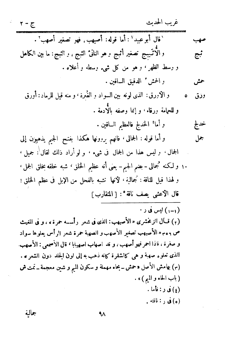 ثبج حمش ورق خَدلج جمل أَبُو عبيد: أما قَوْله: أُصَيْهِب فَهُوَ تَصْغِير أصهب. والأُثَيبج تَصْغِير أثبج وَهُوَ الناتئ الثبج والثبج: مَا بَين الْكَاهِل ووسط الظّهْر وَهُوَ من كل شَيْء وَسطه وَأَعلاهُ. والحمش الدَّقِيق السَّاقَيْن. والأورق: الَّذِي لَونه بَين السوَاد والغُبرة وَمِنْه قيل للرماد: أَوْرَق وللحمامة وَرْقَاء وَإِنَّمَا وَصفه بالأُدمة. وَأما الخدلج فالعظيم السَّاقَيْن. وَأما قَوْله: الجمالى فَإِنَّهُ يروونها هَكَذَا بِفَتْح الْجِيم يذهبون إِلَى الْجمال. وَلَيْسَ هَذَا من الْجمال فِي شَيْء وَلَو أَرَادَ ذَلِك لقَالَ: جميل وَلكنه جُمالي بِضَم الْجِيم يَعْنِي أَنه عَظِيم الْخلق شبه خلقه بِخلق الْجمل وَلِهَذَا قيل للناقة: جُمالية لِأَنَّهَا تشبه بالفحل من الْإِبِل فِي عظم الْخلق قَالَ الْأَعْشَى يصف نَاقَة: [المتقارب]