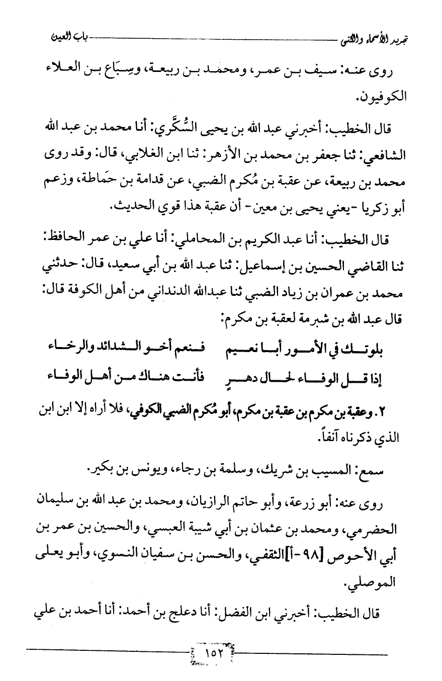 2 - وعقبة بن مكرم بن عقبة بن مكرم، أبو مُكرم الضبي الكوفي، فلا أراه إلا ابن ابن الذي ذكرناه آنفاً.
