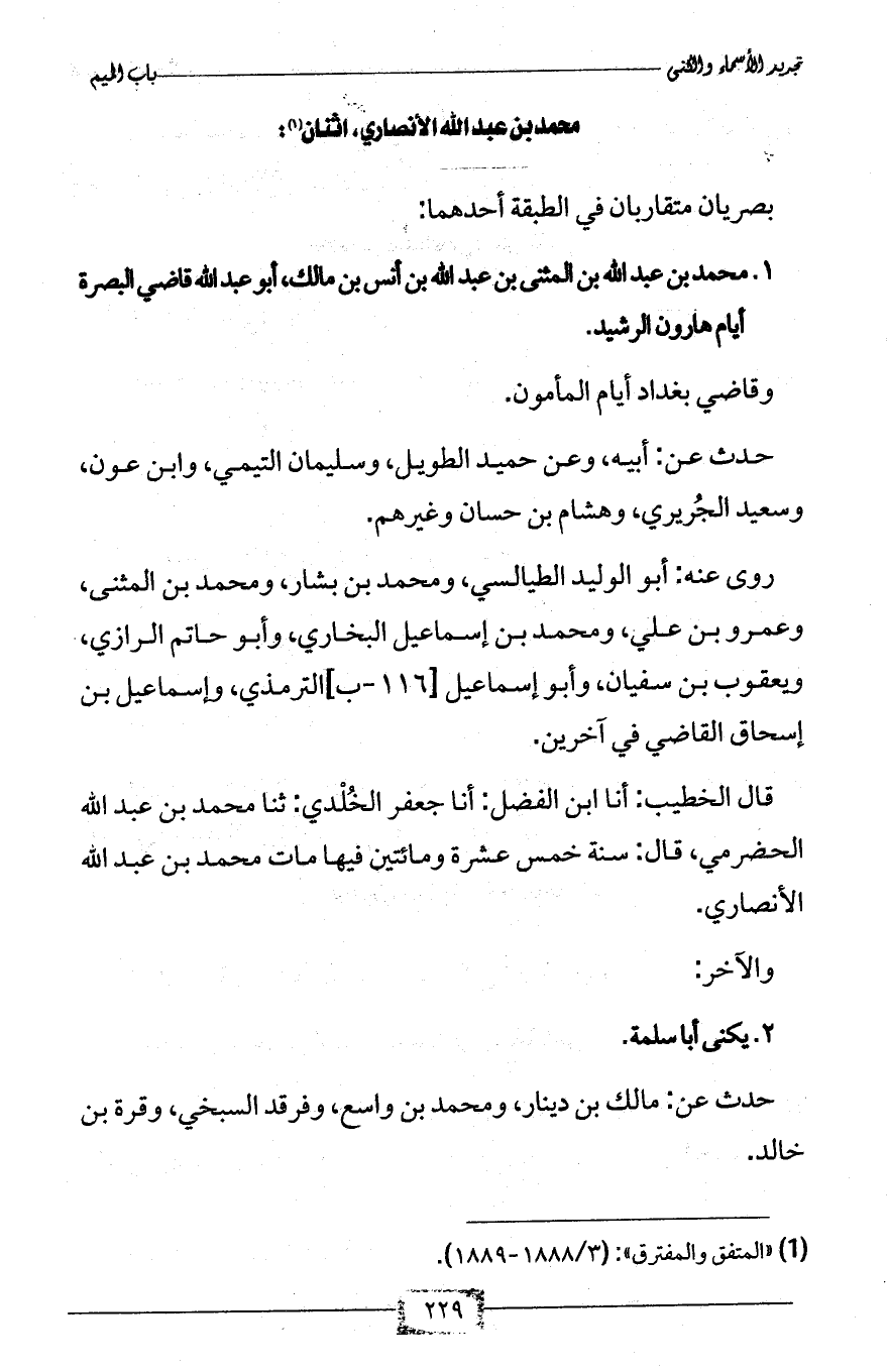 1 - محمد بن عبد الله بن المثنى بن عبد الله بن أنس بن مالك، أبو عبد الله قاضي البصرة أيام هارون الرشيد.