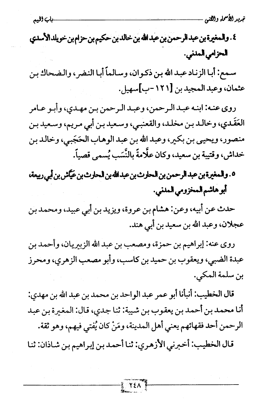 4 - والمغيرة بن عبد الرحمن بن عبد الله بن خالد بن حكيم بن حزام بن خويلد الأسدي الحزامي المدني.