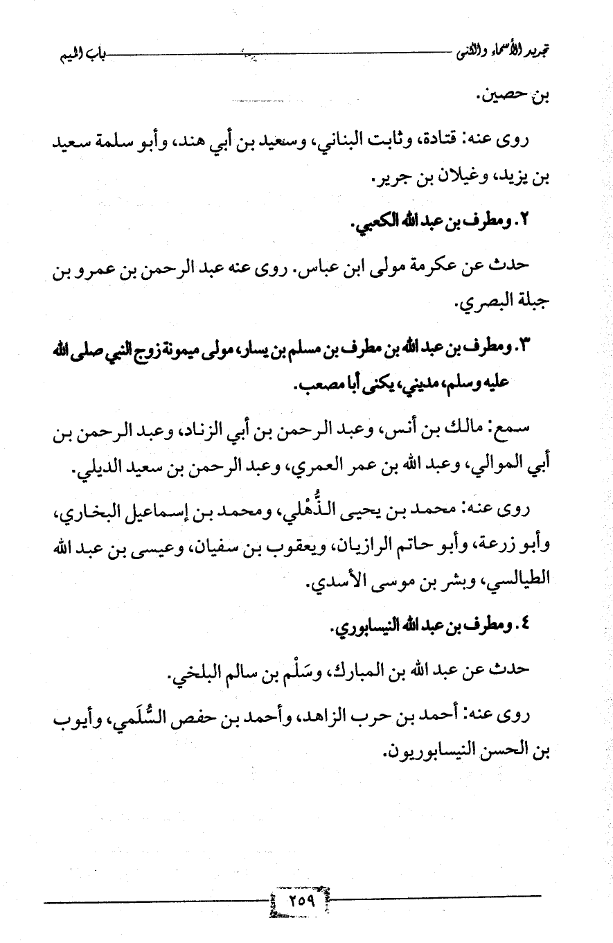 3 - ومطرف بن عبد الله بن مطرف بن مسلم بن يسار، مولى ميمونة زوج النبي صلى الله عليه وسلم، مديني، يكنى أبا مصعب.