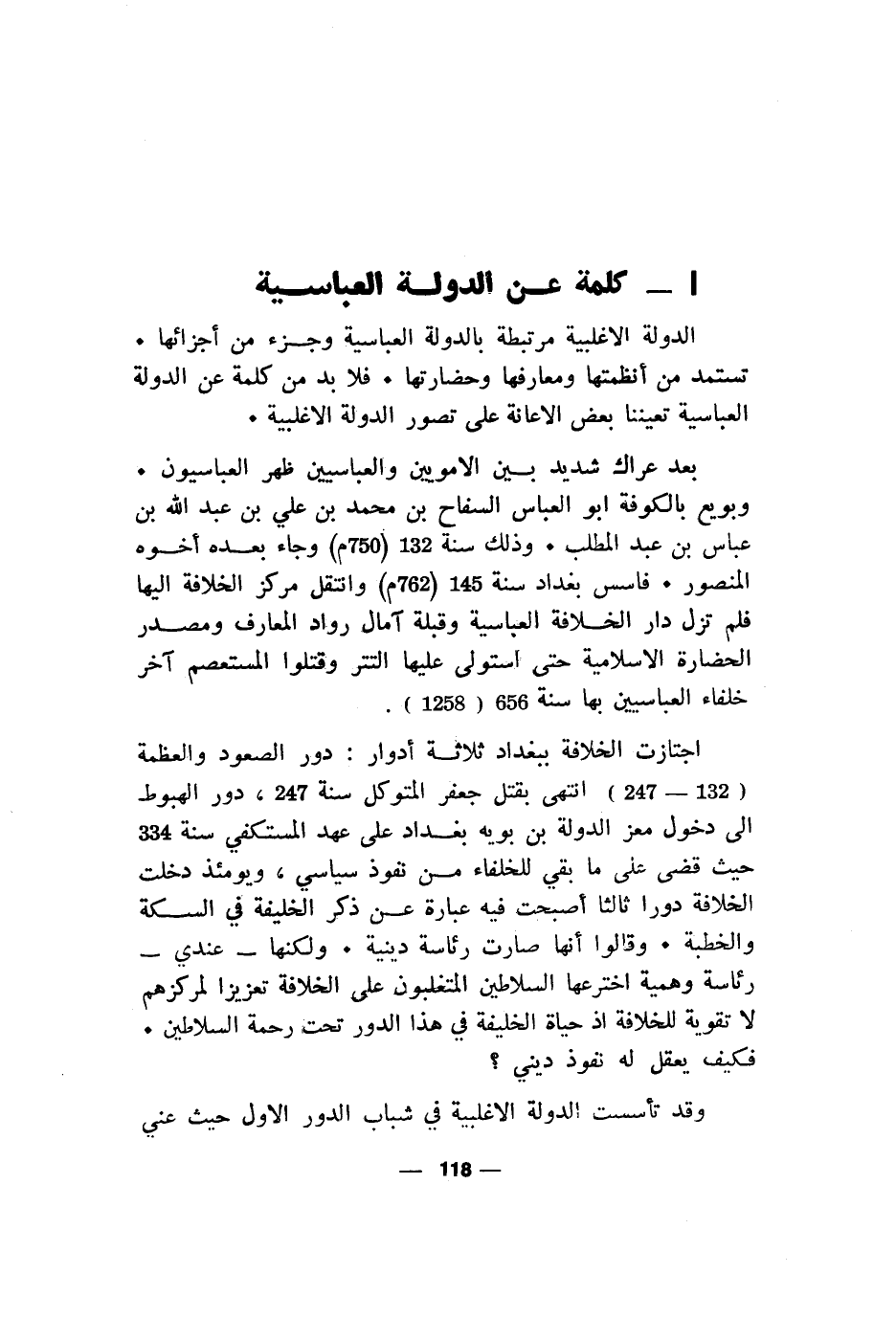 اجتازت الخلافة ببغداد ثلاثة أدوار: دور الصعود والعظمة (132 - 247) انتهى بقتل جعفر المتوكل سنة 247، دور الهبوط الى دخول معز الدولة بن بويه بغداد على عهد المستكفي سنة 334 حيث قضى على ما بقي للخلفاء من نفوذ سياسي، ويومئذ دخلت الخلافة دورا ثالثا أصبحت فيه عبارة عن ذكر الخليفة في السكة والخطبة. وقالوا أنها صارت رئاسة دينية. ولكنها - عندي- رئاسة وهمية اخترعها السلاطين المتغلبون على الخلافة تعزيزا لمركزهم لا تقوية للخلافة اذ حياة الخليفة في هذا الدور تحت رحمة السلاطين. فكيف يعقل له نفوذ ديني؟