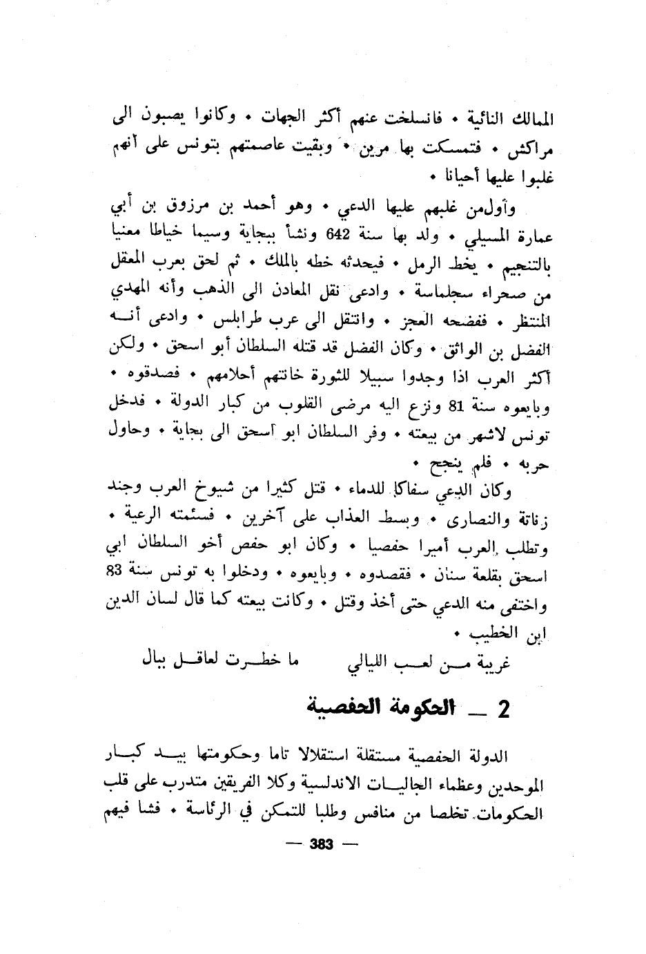 وتطلب العرب أميرا حفصيا. وكان ابو حفص أخو السلطان ابي اسحق بقلعة سنان. فقصدوه. وبايعوه. ودخلوا به تونس سنة 83 واختفى منه الدعي حتى أخذ وقتل. وكانت بيعته كما قال لسان الدين ابن الخطيب.