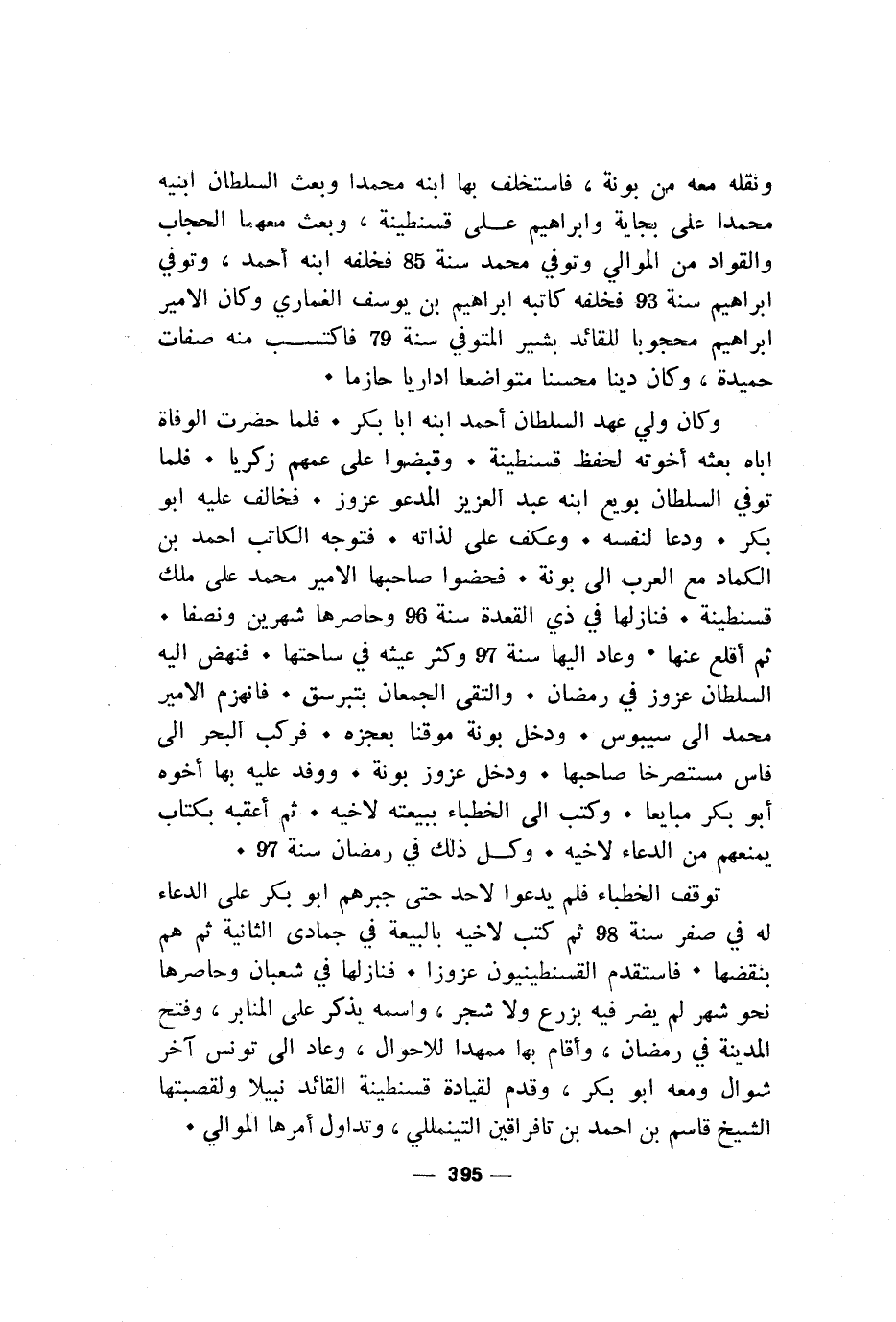 وكان ولي عهد السلطان أحمد ابنه ابا بكر. فلما حضرت الوفاة اباه بعثه أخوته لحفظ قسنطينة. وقبضوا على عمهم زكريا. فلما توفي السلطان بويع ابنه عبد العزيز المدعو عزوز. فخالف عليه ابو بكر. ودعا لنفسه. وعكف على لذاته. فتوجه الكاتب احمد بن الكماد مع العرب الى بونة. فحضوا صاحبها الامير محمد على ملك قسنطينة. فنازلها في ذي القعدة سنة 96 وحاصرها شهرين ونصفا.