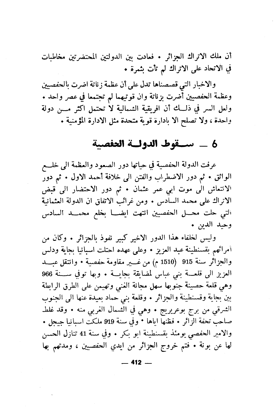 وليس لخلفاء هذا الدور الاخير كبير نفوذ بالجزائر. وكان من امرائهم بقسنطينة عبد العزيز. وعلى عهده احتلت اسبانيا بجاية ودلس والجزائر سنة 915 (1510 م) من غير مقاومة حفصية. وانتقل عبد العزيز الى قلعة بني عباس لمضايقة بجاية. وبها توفي سنة 966 وهي قلعة حصينة جنوبها سهل مجانة الغني وتهيمن على الطرق الرابطة بين بجاية وقسنطينة والجزائر. وقلعة بني حماد بعيدة عنها الى الجنوب الشرقي من برج بوعريريج. وهي في الشمال الغربي منه. وقد غلط صاحب تحفة الزائر. فظنها اياها. وفي سنة 919 ملكت اسبانيا جيجل.