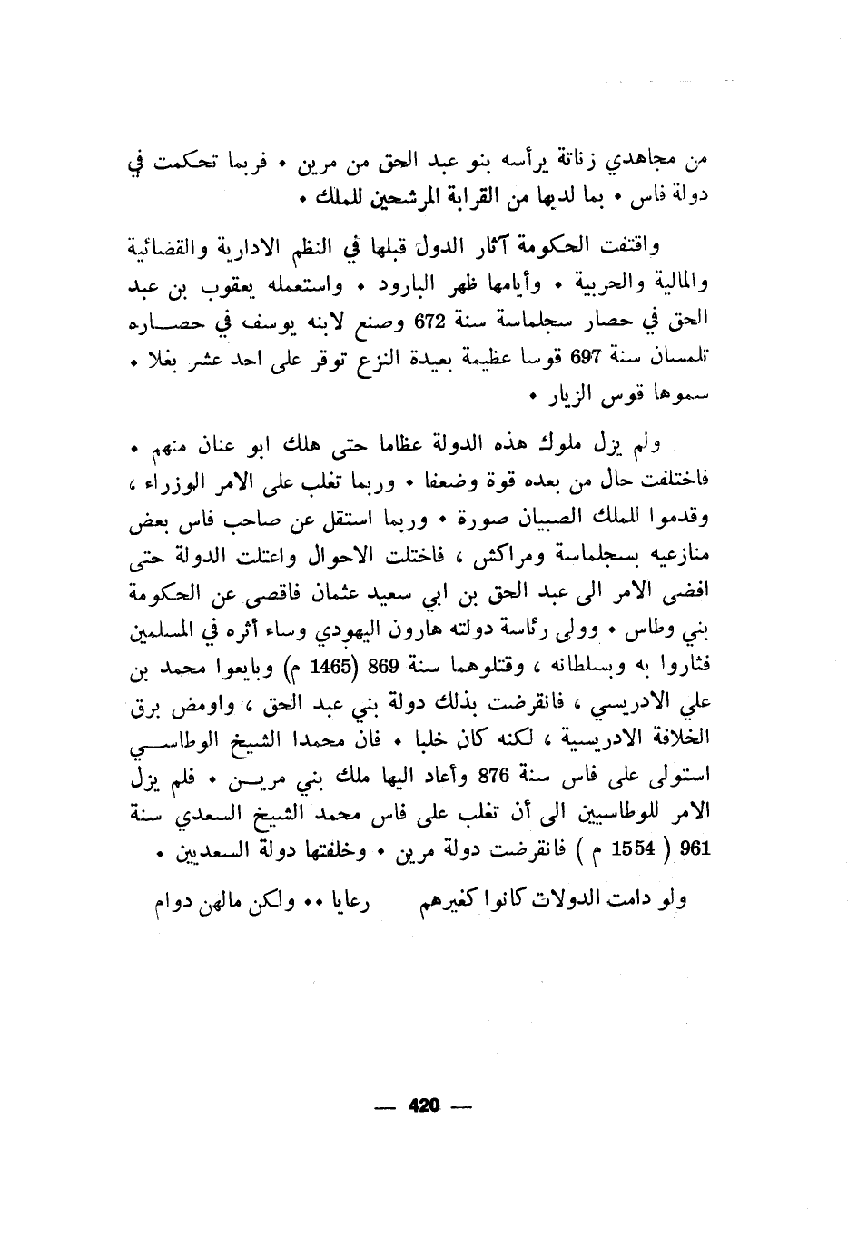 فاختلفت حال من بعده قوة وضعفا. وربما تغلب على الامر الوزراء، وقدموا الملك الصبيان صورة. وربما استقل عن صاحب فاس بعض منازعيه بسجلماسة ومراكش، فاختلت الاحوال واعتلت الدولة حتى افضى الامر الى عبد الحق بن ابي سعيد عثمان فاقصى عن الحكومة بني وطاس. وولى رئاسة دولته هارون اليهودي وساء أثره في المسلمين فثاروا به وبسلطانه، وقتلوهما سنة 869 (1465 م) وبايعوا محمد بن علي الادريسي، فانقرضت بذلك دولة بني عبد الحق، واومض برق الخلافة الادريسية، لكنه كان خلبا. فان محمدا الشيخ الوطاسي استولى على فاس سنة 876 وأعاد اليها ملك بني مرين. فلم يزل الامر للوطاسيين الى أن تغلب على فاس محمد الشيخ السعدي سنة 961) 1554 م) فانقرضت دولة مرين. وخلفتها دولة السعديين.
