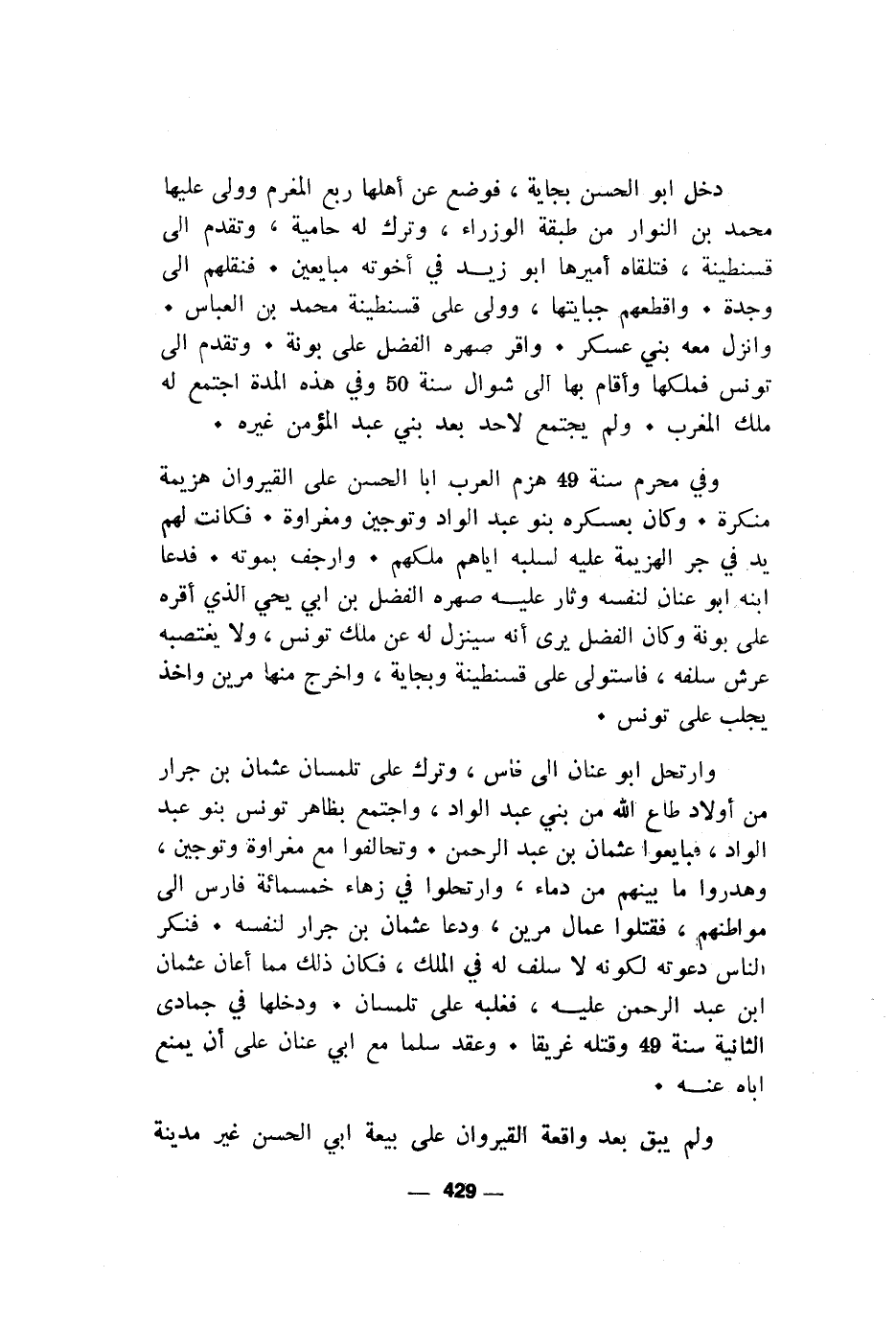 وفي محرم سنة 49 هزم العرب ابا الحسن على القيروان هزيمة منكرة. وكان بعسكره بنو عبد الواد وتوجين ومغراوة. فكانت لهم يد في جر الهزيمة عليه لسلبه اياهم ملكهم. وارجف بموته. فدعا ابنه ابو عنان لنفسه وثار عليه صهره الفضل بن ابي يحي الذي أقره على بونة وكان الفضل يرى أنه سينزل له عن ملك تونس، ولا يغتصبه عرش سلفه، فاستولى على قسنطينة وبجاية، واخرج منها مرين واخذ يجلب على تونس.