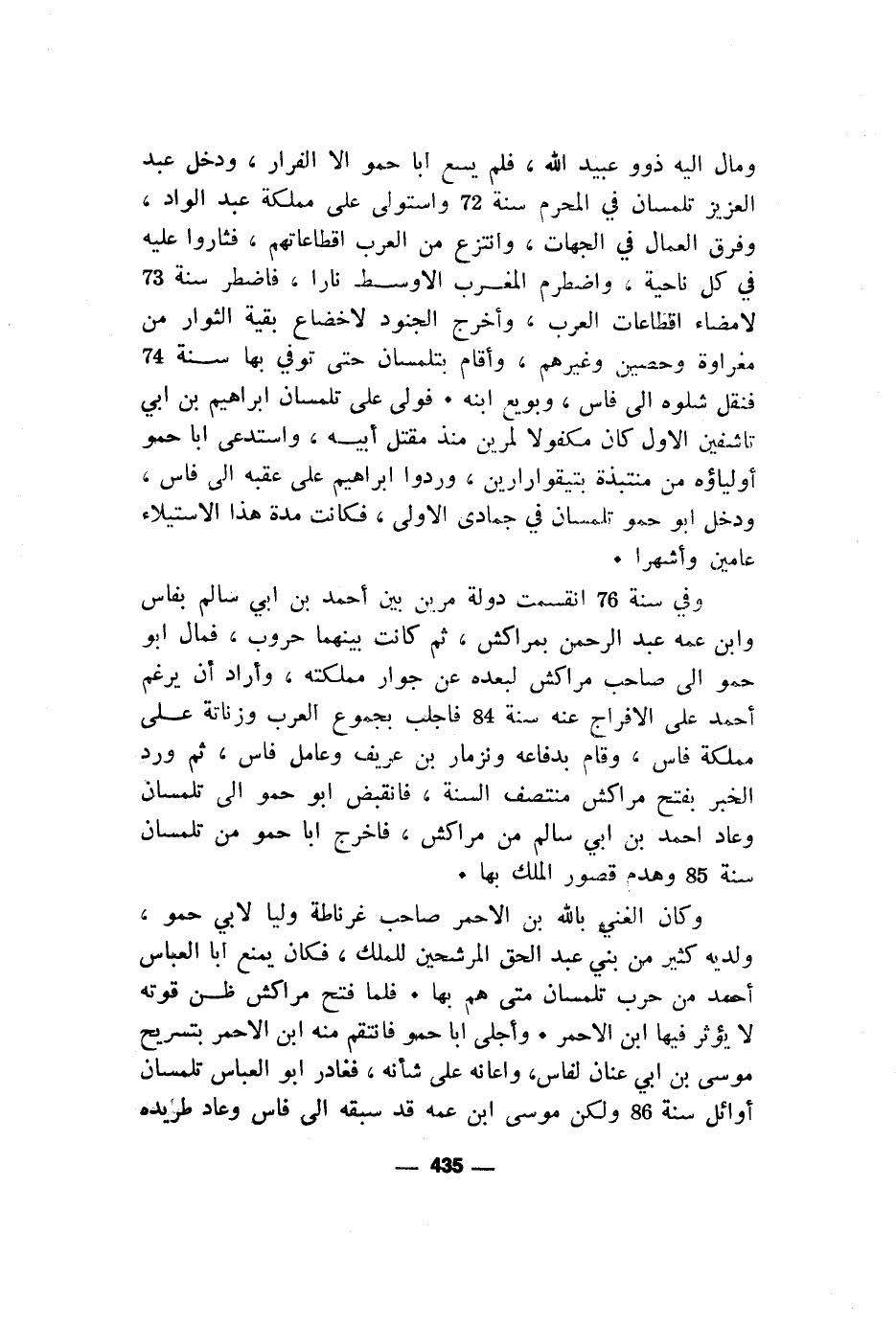 ومال اليه ذوو عبيد الله، فلما يسع أبا حمو الا الفرار، ودخل عبد العزيز تلمسان في المحرم سنة 72 واستولى على مملكة عبد الواد، وفرق العمال في الجهات، وانتزع من العرب اقطاعاتهم، فثاروا عليه في كل ناحية، واضطرهم المغرب الاوسط نارا، فاضطر سنة 73 لامضاء اقطاعات العرب، وأخرج الجنود لاخضاع بقية الثوار من مغراوة وحصين وغيرهم، وأقام بتلمسان حتى توفي بها سنه 74 فنقل شلوه الى فاس، وبويع ابنه. فولى على تلمسان ابراهيم بن ابي تاشفين الاول كان مكفولا لمرين منذ مقتل أبيه، واستدعى ابا حمو أولياؤه من منتبذة بتيقوارارين، وردوا ابراهيم على عقبه الى فاس، ودخل أبو حمو تلمسان في جمادى الاولى، فكانت مدة هذا الاستيلاء عامين وأشهرا.