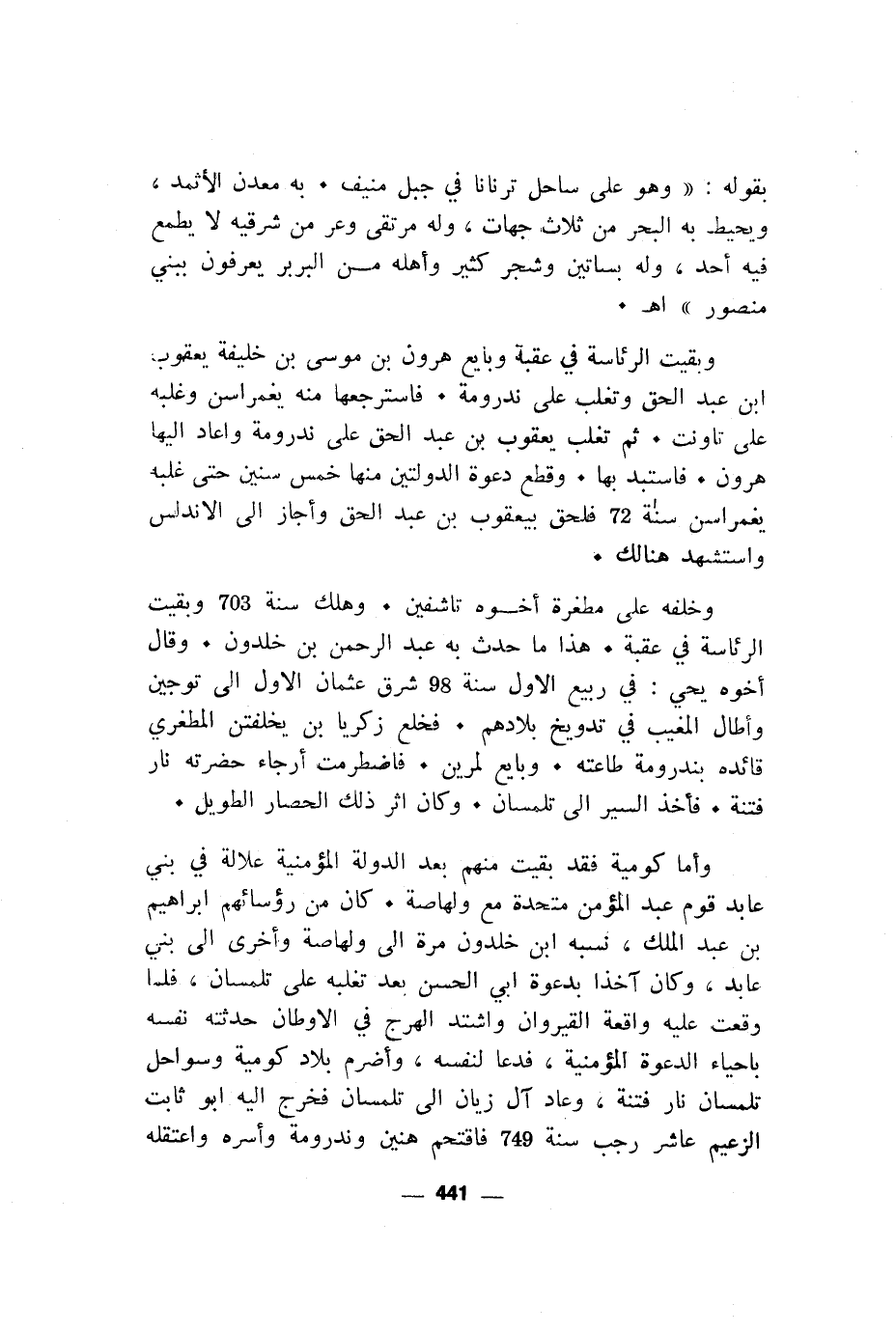 وبقيت الرئاسة في عقبة وبايع هرون بن موسى بن خليفة يعقوب ابن عبد الحق وتغلب على ندرومة. فاسترجعها منه يغمراسن وغلبه على تاونت. ثم تغلب يعقوب بن عبد الحق على ندرومة واعاد الهيا هرون. فاستبد بها. وقطع دعوة الدولتين منها خمس سنين حتى غلبه يغمراسن سنة 72 فلحق بيعقوب بن عبد الحق وأجار الى الاندلس واستشهد هنالك.