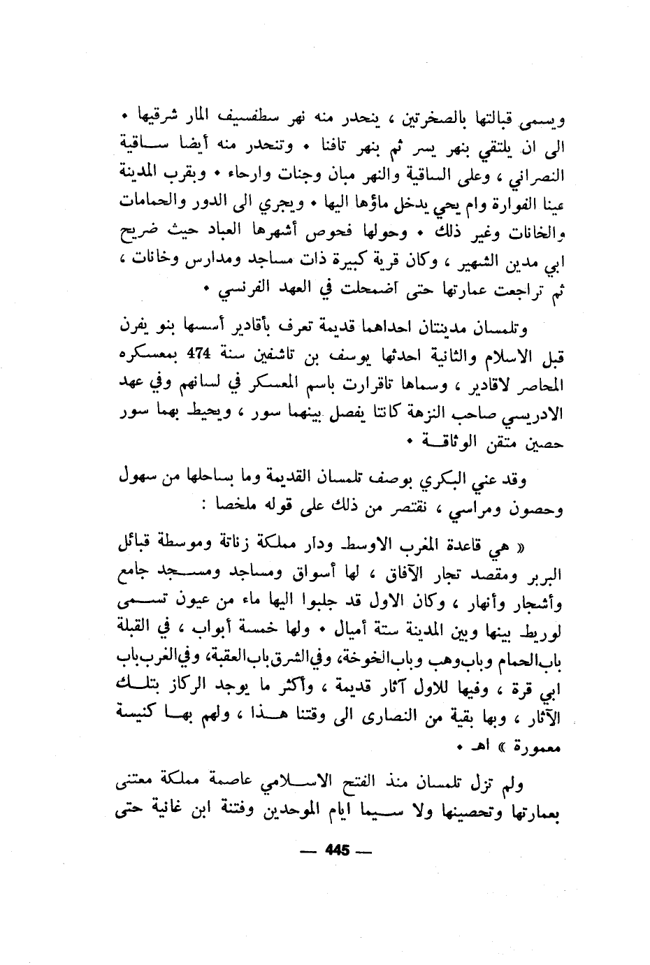 وقد عني البكري بوصف تلمسان القديمة وما بساحلها من سهول وحصون ومراسي، نقتصر من ذلك على قوله ملخصا: