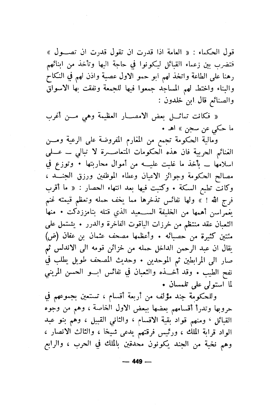 ومالية الحكومة تجمع من المغارم المفروضة على الرعية ومن الغنائم الحربية فان هذه الحكومات المتعاصرة لا تبالي- على اسلامها- بأخذ ما غلبت عليه من أموال محاربتها. وتوزع في مصالح الحكومة وجوائز الأعيان وعطاء الموظفين ورزق الجند، وكانت تطبع السكة. وكتبت فيها بعد انتهاء الحصار: "ما أقرب فرج الله! " ولها نفائس تذخرها مما يخف حمله وتعظم قيمته غنم يغمراسن أهمها من الخليفة السعيد الذي قتله بتامززدكت. منها الثغبان عقد منتظم من خرزات الياقوت الفاخرة والدرر. يشتمل على مئتين كثيرة من حصبائه. وأعظمها مصحف عثمان بن عفان (ض) يقال ان عبد الرحمن الداخل حمله من خزائن قومه الى الاندلس ثم صار الى المرابطين ثم الموحدين. وحديث المصحف طويل يطلب في نفح الطيب. وقد أخذه والثعبان في نفائس ابو الحسن المريني لما استولى على تلمسان.