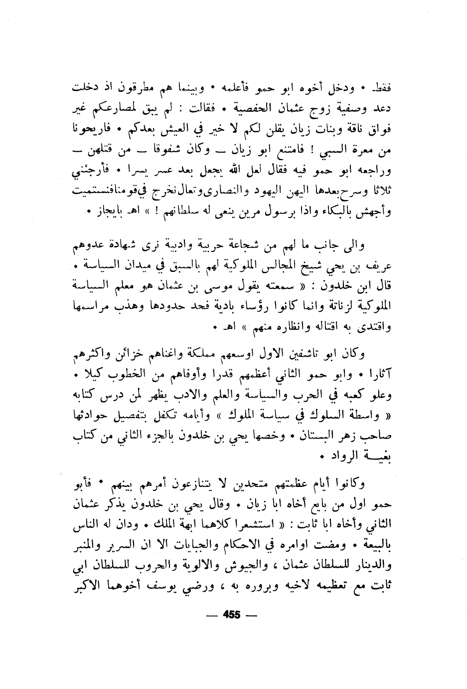 فقط. ودخل أخوه ابو حمو فأعمله. وبينما هم مطرقون اذ دخلت دعد وصفية زوج عثمان الحفصية. فقالت: لم يبق لمصارعكم غير فواق ناقة وبنات زيان يقلن لكم لا خير في العيش بعدكم. فاريحونا من معرة السبي! فامتنع ابو زيان- وكان شفوقا- من قتلهن- وراجعه ابو حمو فيه فقال لعل الله يجعل بعد عسر يسرا. فأرحئني ثلاثا وسرح بعدها اليهن اليهود والنصارى وتعال نخرج في قومنا فنستميت وأجهش بالبكاء واذا برسول مرين ينعى له سلطانهم! " اهـ بايجاز.