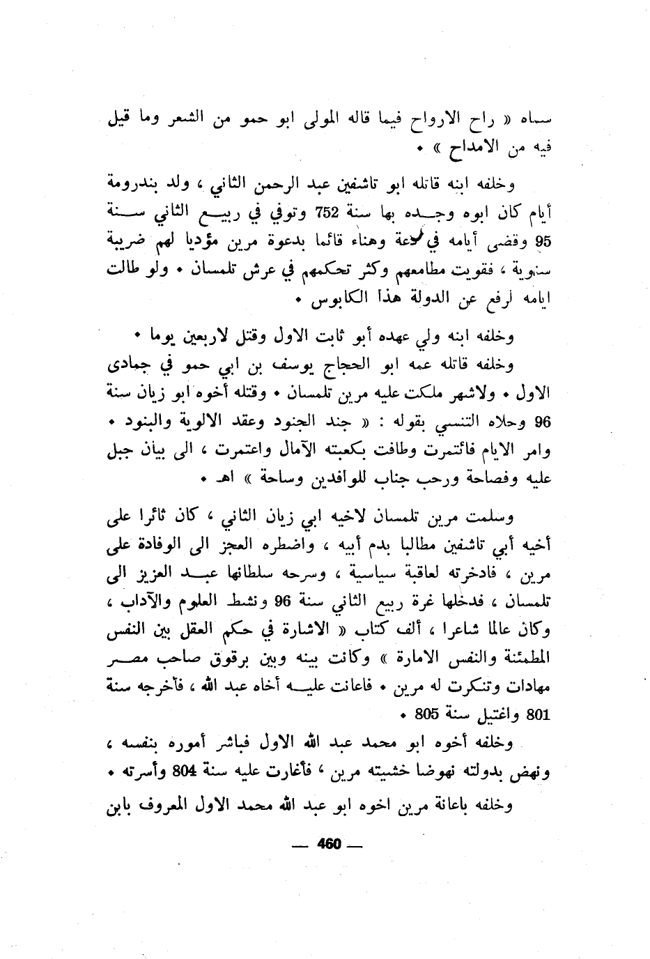وخلف ابنه قاتله ابو تاشفين عبد الرحمن الثاني، ولد بندرومة أيام كان ابوه وجده بها سنة 752 وتوفي في ربيع الثاني سنة 95 وقضى أيامه في دعة وهناء قائما بدعوة مرين مؤديا لهم ضريبة سنوية، فقويت مطامعهم وكثر تحكمهم في عرش تلمسان. ولو طالت ايامه لرفع عن الدولى هذا الكابوس.