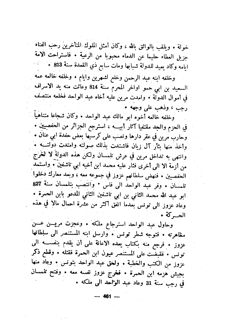 خولة. ويلقب بالواثق بالله، وكان أمثل الملوك المتأخرين رحب الفناء جزيل العطاء حليما عن الدماء محبوبا من الرعية. فاستراحت الامة ايامه وكاد يعيد للدولة شبابها ومات سابع ذي القعدة سنة 813.