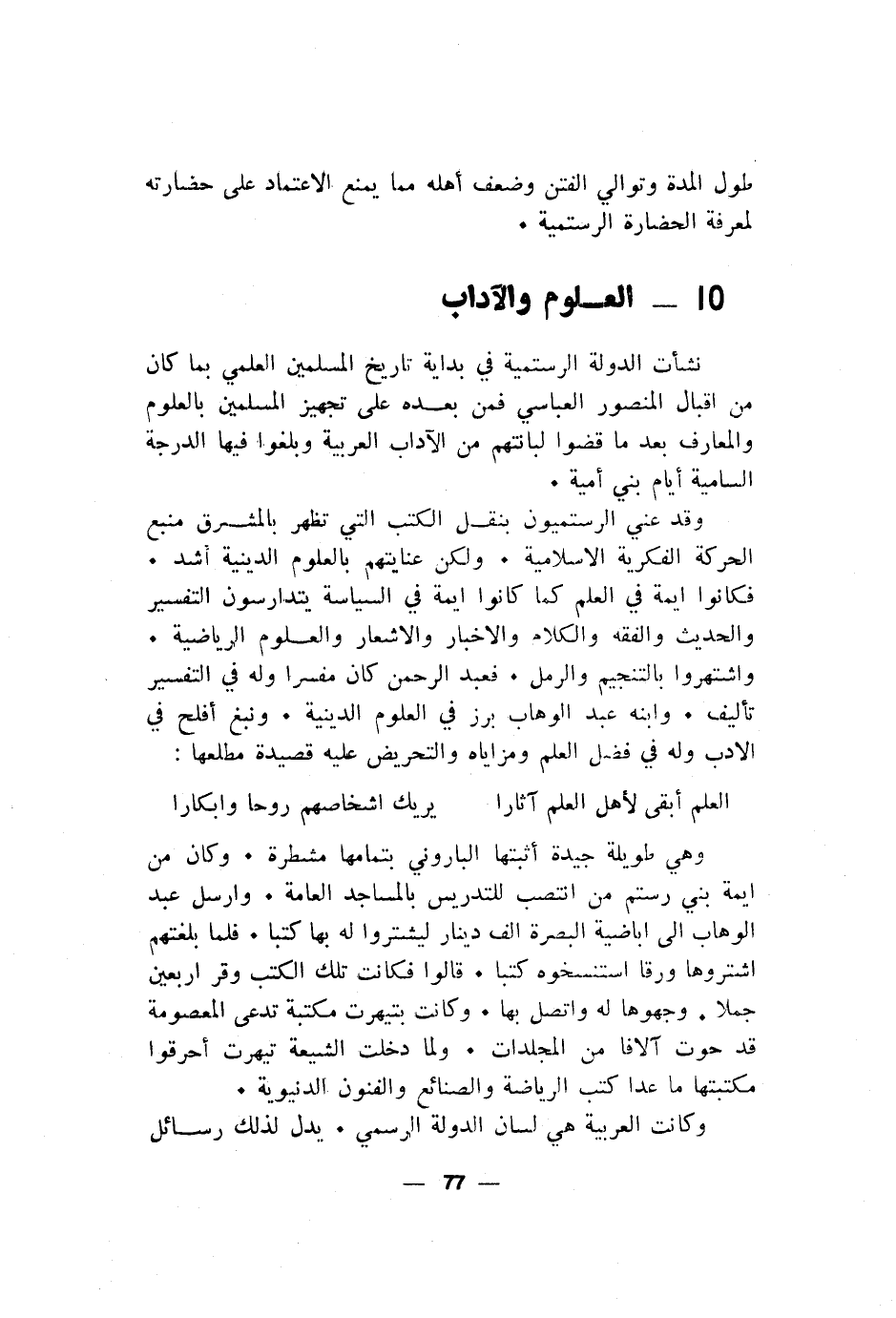 وهي طويلة جيدة أثبتها الباروني بتمامها مشطرة. وكان من ايمة بني رستم من انتصب للتدريس بالمساجد العامة. وارسل عبد الوهاب الى اباضية البصرة ألف دينار ليشتروا له بها كتبا. فلما بلغتهم اشتروها ورقا استنسخوه كتبا. قالوا فكانت تلك الكتب وقر اربعين جملا. وجهوها له واتصل بها. وكانت بتيهرت مكتبة تدعى المعصومة قد حوت آلافا من المجلدات. ولما دخلت الشيعة تيهرت أحرقوا مكتبتها ما عدا كتب الرياضة والصنائع والفنون الدنيوية.