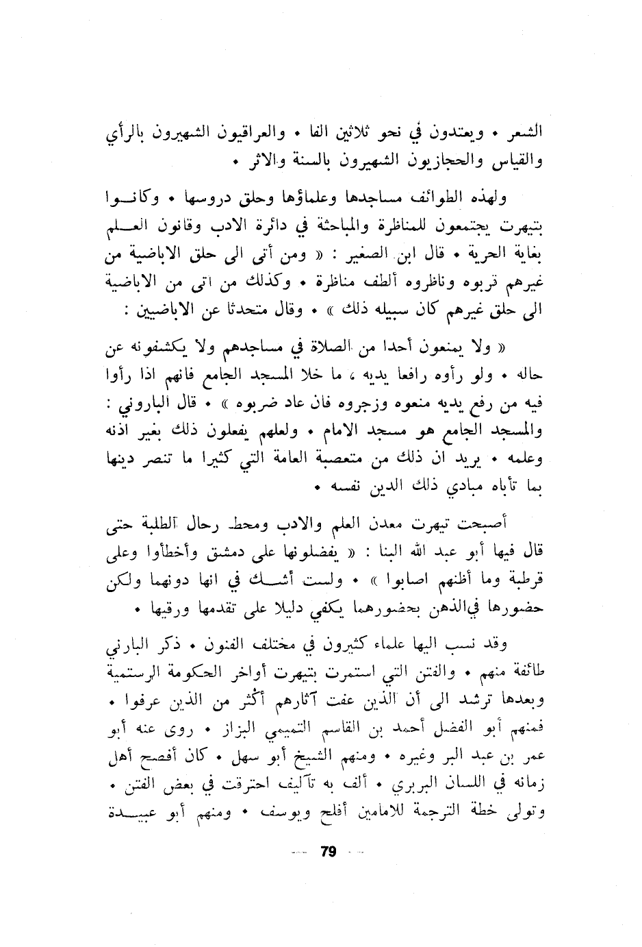 " ولا يمنعون أحدا من الصلاة في مساجدهم ولا يكشفونه عن حاله. ولو رأوه رافعا يديه، ما خلا المسجد الجامع فانهم اذا رأوا فيه من رفع يديه منعوه وزجروه فان عاد ضربوه". قال الباروني: والمسجد الجامع هو مسجد الامام. ولعلهم يفعلون ذلك بغير اذنه وعلمه. يريد ان ذلك من متعصبة العامة التي كثيرا ما تنصر دينها بما تأباه مبادي ذلك الدين نفسه.