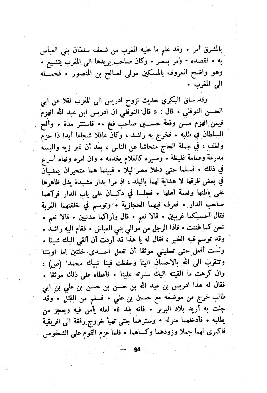 وقد ساق البكري حديث نزوح ادريس الى المغرب نقلا عن ابي الحسن النوفلي. قال: "قال النوفلي ان ادريس ابن عبد الله انهزم فيمن انهزم من وقعة حسين صاحب فخ .. فاستتر مدة. وألح السلطان في طلبه. فخرج به راشد، وكان عاقلا شجاعا أبدا ذا حزم ولطف، في جملة الحاج منحاشا عن الناس، بعد أن غيه زيه والبسه مدرعة وعمامة غليظة. وصيره كالغلام يخدمه. وان امره ونهاه أسرع في ذلك. فسلما حتى دخلا مصر ليلا. فبينما هما متحيران يمشيان في بعض طرقها لا هداية لهما بالبلد، اذ مرا بدار مشيدة يدل ظاهرها على باطنها ونعمة أهلها. فجلسا في دكان على باب الدار فرآهما صاحب الدار. فعرف فيهما الحجازية. وتوسم في خلقتهما الغربة فقال أحسبكما غريبين. قالا نعم. قال وأراكما مدنيين. قالا نعم. نحن كما ظننت. فاذا الرجل من موالي بني العباس. فقام اليه راشد. وقد توسم. فيه الخير، فقال له يا هذا قد أردت أن ألقي اليك شيئا. ولست أفعل حتى تعطيني موثقا أن تفعل احدى خلتين اما اويتنا وتتقرب الى الله بالاحسان الينا وحفظت فينا نبيك محمدا (ص)، وان كرهت ما القيته اليك سترته علينا. فأعطاه على ذلك موثقا. فقال له هذا ادريس بن عبد الله بن حسن بن حسن بن علي بن ابي طالب خرج من موضعه مع حسين بن علي. فسلم من القتل. وقد جئت به أريد بلاد البربر. فانه بلد ناء لعله يأمن فيه ويعجز من يطلبه. فأدخلهما منزله. وسترهما حتى تهيأ خروج ورفقة الى افريقية فاكترى لهما جملا وزودهما وكساهما. فلما عزم القوم على الشخوص