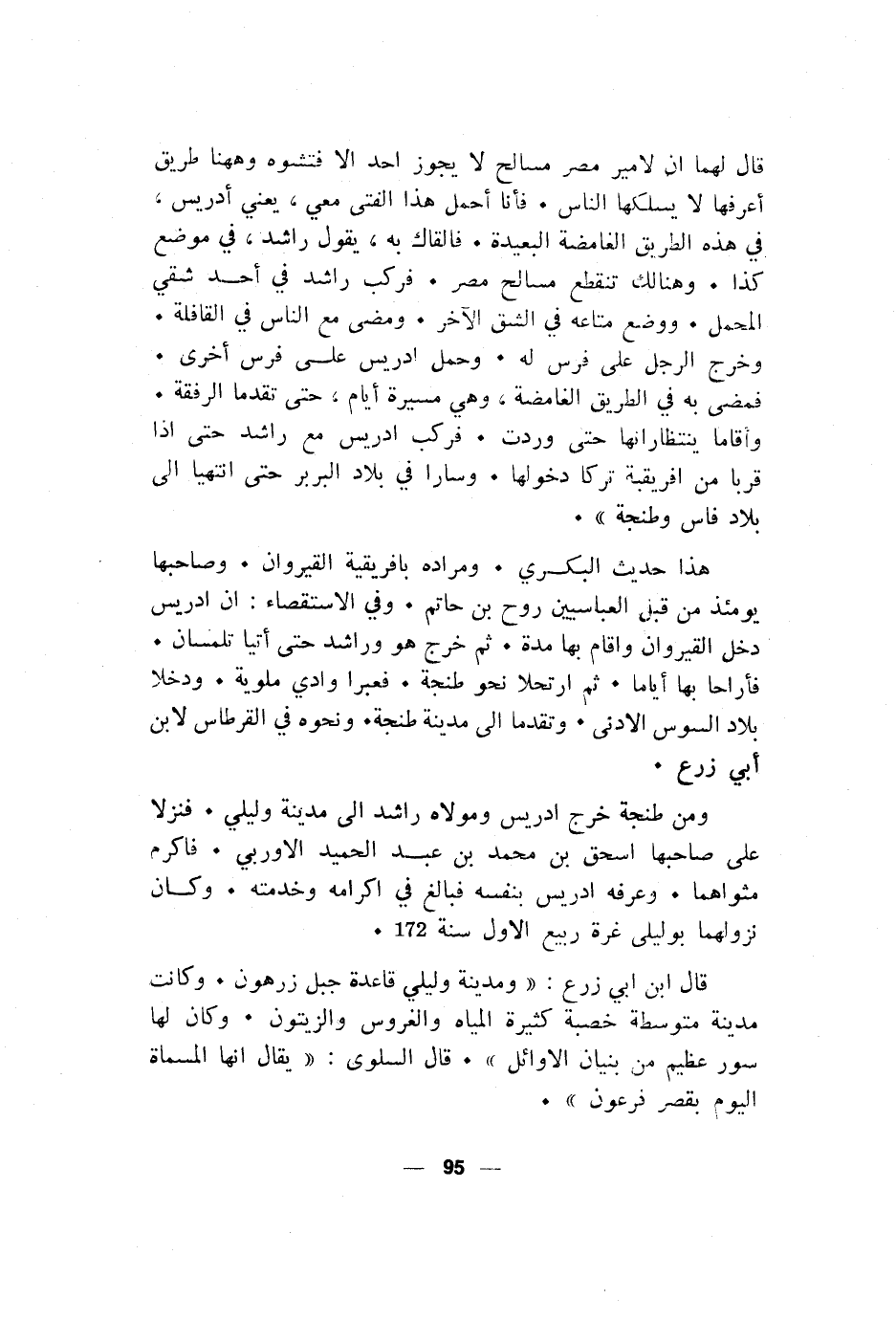 قال لهما ان لامير مصر مسالح لا يجوز احد الا فتشوه وههنا طريق أعرفها لا يسلكها الناس. فأنا أحمل هذا الفتى معي، يعني أدريس. في هذه الطريق الغامضة البعيدة. فالقاك به، يقول راشد، في موضع كذا. وهنالك تنقطع مسالح مصر. فكب راشد في أحد شقي المحمل. ووضع متاعه في الشق الآخر. ومضى مع الناس في القافلة. وخرج الرجل على فرس له. وحمل ادريس على فرس أخرى. فمضى به في الطريق الغامضة، وهي مسيرة أيام، حتى تقدما الرفقة. وأقاما ينتظرانها حتى وردت. فركب ادريس مع راشد حتى اذا قربا من افريقية تركا دخولها. وسارا في بلاد البربر حتى انتهيا الى بلاد فاس وطنجة".