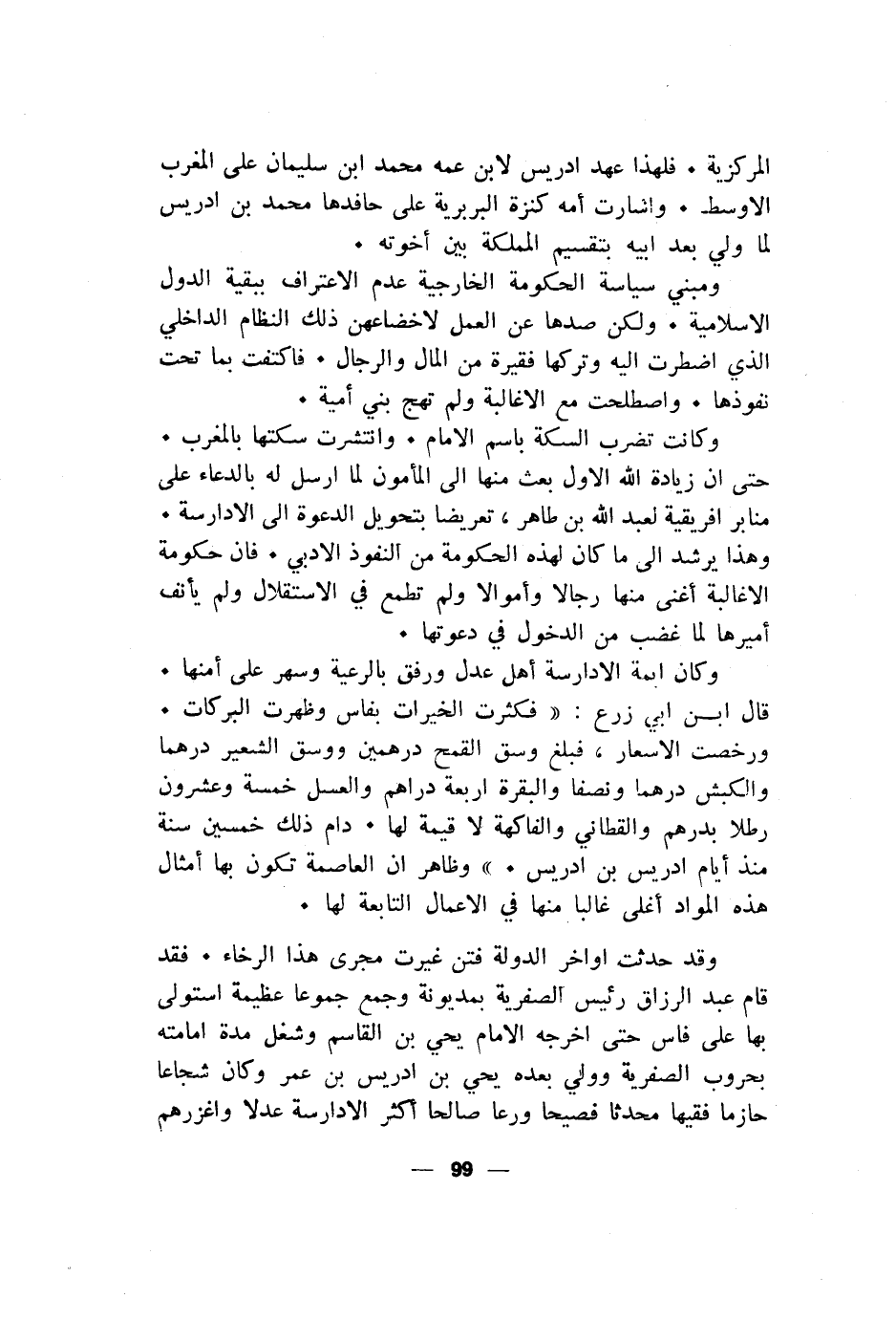 وكانت تضرب السكة باسم الامام. وانتشرت سكتها بالمغرب. حتى ان زيادة الله الاول بعث منها الى المأمون لما ارسل له بالدعاء على منابر افريقية لعبد الله بن طاهر، تعريضا بتحويل الدعوة الى الادارسة. وهذا يرشد الى ما كان لهذه الحكومة من النفوذ الادبي. فان حكومة الاغالبة أغنى منها رجالا وأموالا ولم تطمع في الاستقلال ولم يأنف أميرها لما غضب من الدخول في دعوتها.