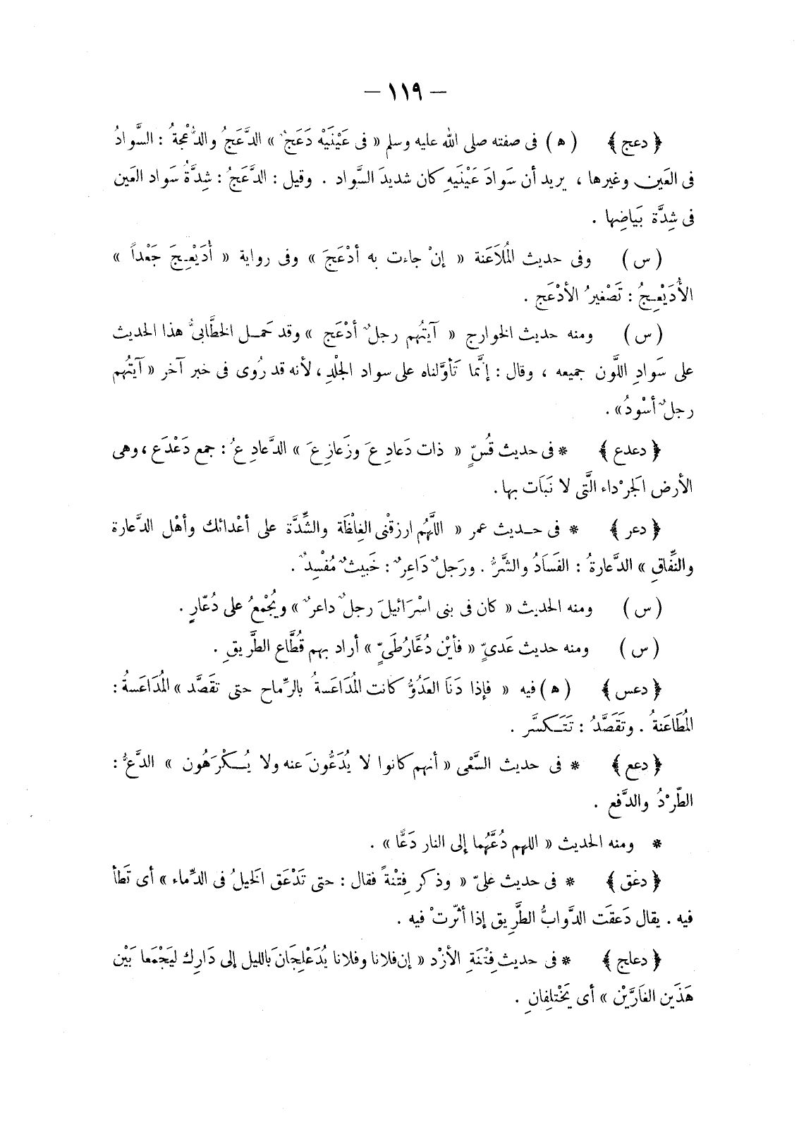 (هـ) فِي صِفَتِهِ صَلَّى اللَّهُ عَلَيْهِ وَسَلَّمَ «فِي عَيْنَيْه دَعَجٌ» الدَّعَجُ والدُّعْجَةُ: السَّوادُ فِي العَين وَغَيْرِهَا، يُرِيدُ أَنَّ سَوادَ عَيْنَيهِ كَانَ شديدَ السَّواد. وَقِيلَ: الدَّعَجُ: شِدَّةُ سَواد العَين فِي شِدَّة بَياضِها.