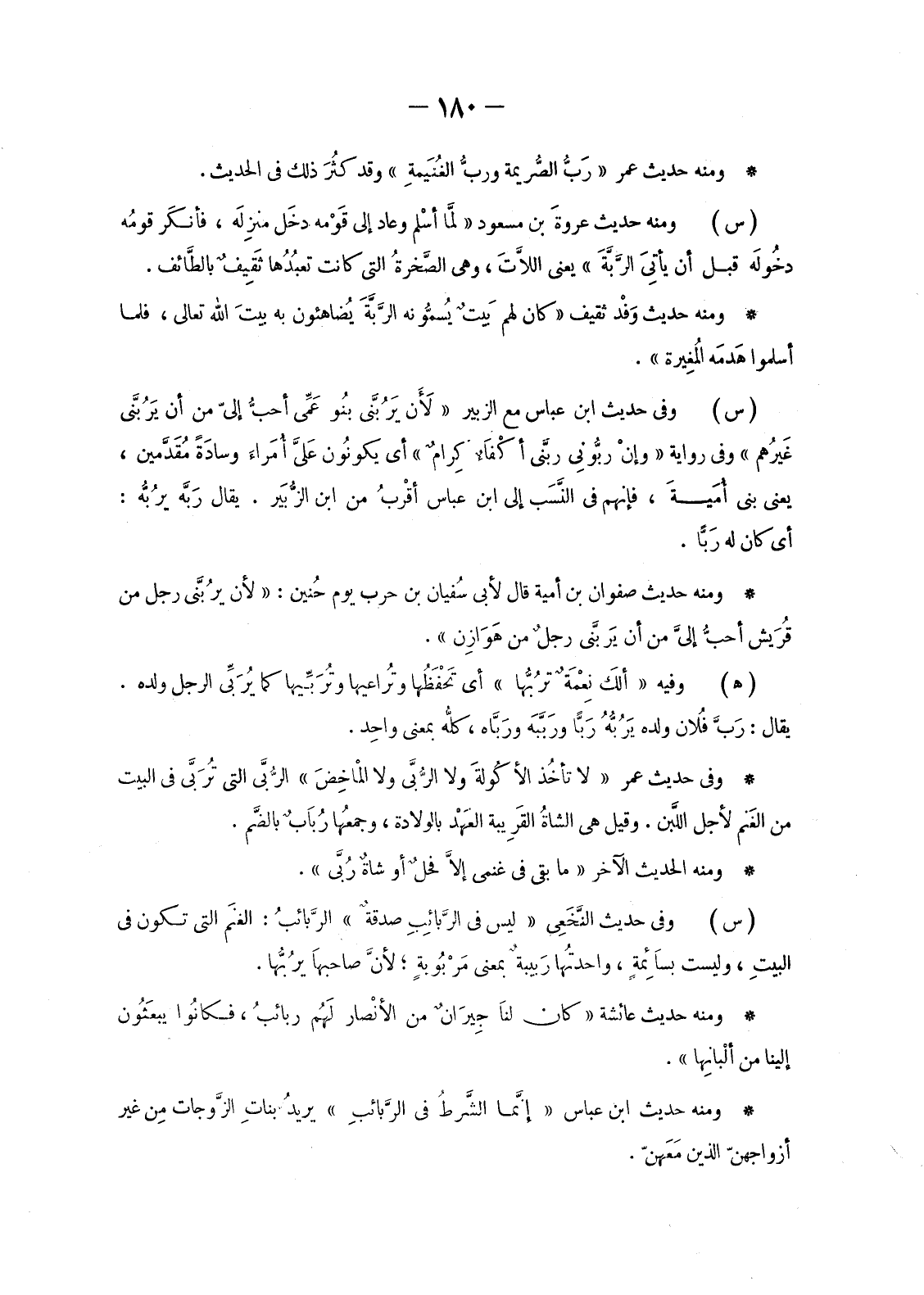 وَمِنْهُ حَدِيثُ ابْنِ عَبَّاسٍ «إنَّما الشَّرطُ فِي الرَّبَائِبِ» يريدُ بناتِ الزَّوجات مِن غَيْرِ أَزْوَاجِهِنَّ الَّذِينَ مَعَهنّ.