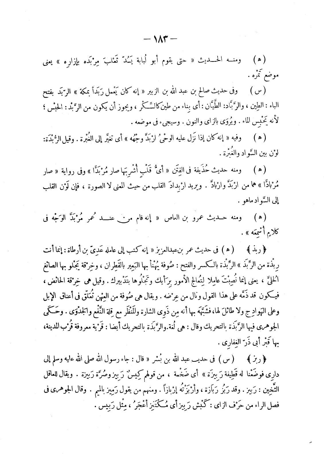 (هـ) وَفِيهِ «إِنَّهُ كَانَ إِذَا نَزل عَلَيْهِ الوحْيُ ارْبَدَّ وجْهُه» أَيْ تغيَّر إِلَى الغُبْرة. وَقِيلَ الرُّبْدَةُ: