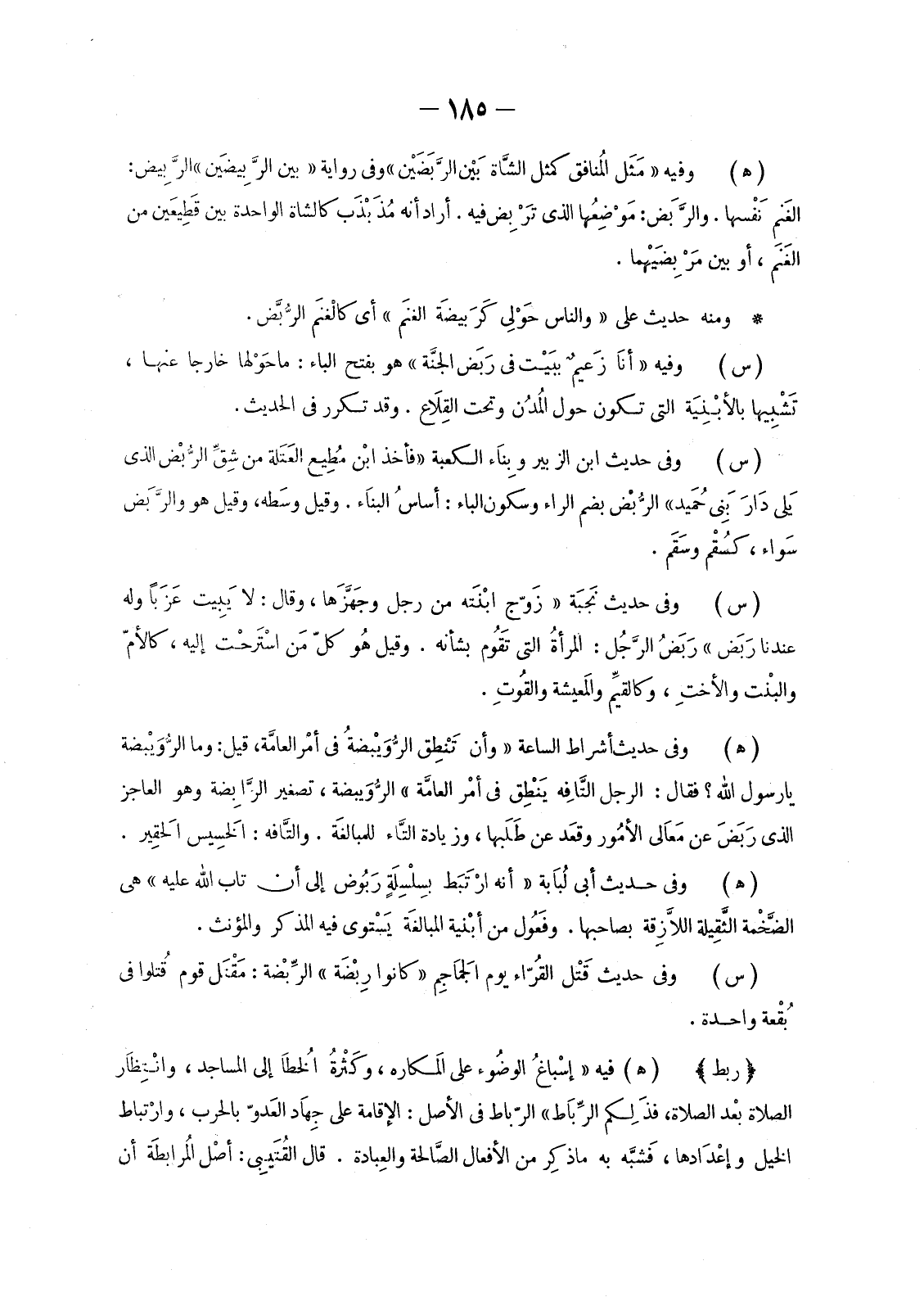 (هـ) فِيهِ «إسْباغُ الوضُوء عَلَى المَكاره، وكَثْرةُ الخُطَا إِلَى الْمَسَاجِدِ، وانْتِظَار الصَّلَاةِ بعْد الصَّلَاةِ، فذَلِكم الرِّبَاطُ» الرِّبَاطُ فِي الْأَصْلِ: الْإِقَامَةُ عَلَى جِهَادِ الْعَدُوِّ بِالْحَرْبِ، وَارْتِبَاطُ الْخَيْلِ وَإِعْدَادُهَا، فَشَبَّهَ بِهِ مَا ذكِر مِنَ الْأَفْعَالِ الصَّالحة والعِبادة. قَالَ القُتَيبِي: أصْل الْمُرَابَطَةِ أَنْ