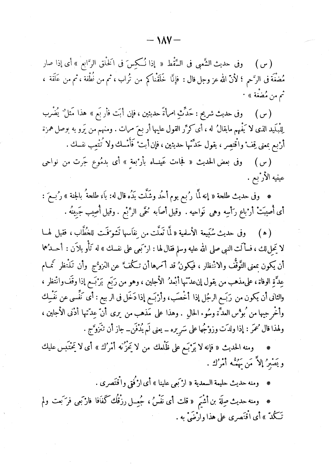 (هـ) وَفِي حَدِيثِ سُبَيعة الْأَسْلَمِيَّةِ «لمَّا تَعلَّت مِنْ نِفَاسها تَشوّفَت للخُطَّاب، فَقِيلَ لَهَا لَا يَحِل لَكِ، فسألَت النبيَّ صَلَّى اللَّهُ عَلَيْهِ وَسَلَّمَ فَقَالَ لَهَا: ارْبَعِي عَلَى نَفْسِكِ» لَهُ تَأْويلاَن: أحدُهما أَنْ يَكُونَ بِمَعْنَى التَّوقُّف والانْتظار، فيكونُ قَدْ أمَرها أَنْ تكُفَّ عن التزوُّج وأن تنتظر تَمام عِدَّةِ الْوَفَاةِ، عَلَى مَذْهَبِ مَنْ يَقُولُ إِنَّ عِدَّتَهَا أبْعدُ الْأَجَلَيْنِ، وَهُوَ مِنْ رَبَعَ يَرْبَعُ إِذَا وقَف وانْتظر، وَالثَّانِي أَنْ يَكُونَ مِنْ رَبَعَ الرجُل إِذَا أخْصَب، وأَرْبَع إِذَا دَخَل فِي الرَّبِيعِ: أَيْ نَفِّسي عَنْ نَفْسِك وأخْرِجيها مِنْ بُؤُس العدِّة وسُوء الحالِ. وَهَذَا عَلَى مَذهب مَنْ يَرَى أَنَّ عِدّتها أدْنى الْأَجَلَيْنِ، وَلِهَذَا قَالَ عُمَر: إِذَا ولدَت وزوْجُها عَلَى سَرِيره- يَعْنِي لَمْ يُدْفَنْ- جَازَ أَنْ تتَزوَّج.