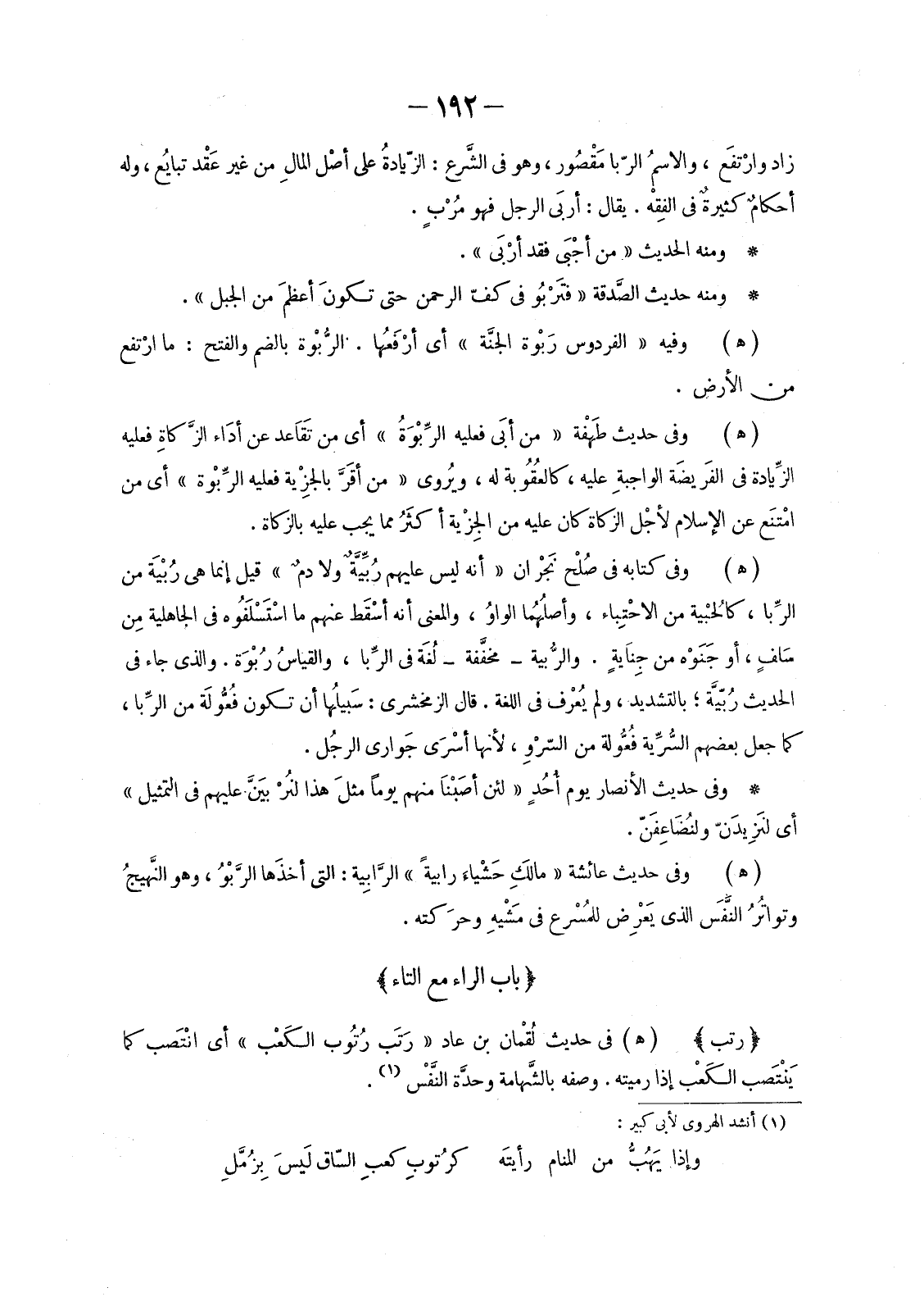 (هـ) وَفِي حَدِيثِ طَهْفة «مَنْ أبَى فَعَلَيْهِ الرِّبْوَةُ» أَيْ مَنْ تَقَاعد عَنْ أدَاء الزَّكاةِ فَعَلَيْهِ الزِّيادة فِي الفَريضَة الواجبةِ عَلَيْهِ، كالعُقُوبة لَهُ، ويُروى «مَنْ أقَرَّ بالجِزْية فَعَلَيْهِ الرِّبْوَةُ» أَيْ مَنِ امْتنَع عَنِ الْإِسْلَامِ لأجْل الزَّكَاةِ كَانَ عَلَيْهِ مِنَ الجِزْية أكثَرُ مِمَّا يَجِبُ عَلَيْهِ بِالزَّكَاةِ.