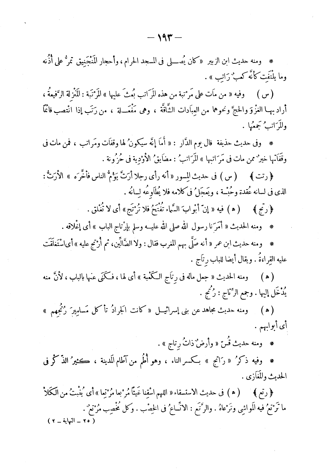 وَفِي حَدِيثِ حُذَيْفَةَ قَالَ يَوْمَ الدَّار: «أَمَا إنَّه سيكونُ لَهَا وقفَات ومَرَاتِبُ، فَمَنْ مَاتَ فِي وقَفَاتها خيرٌ مِمَّنْ مَاتَ فِي مَرَاتِبِهَا» الْمَرَاتِبُ: مضَايقُ الأوْدِية فِي حُزُونة.
