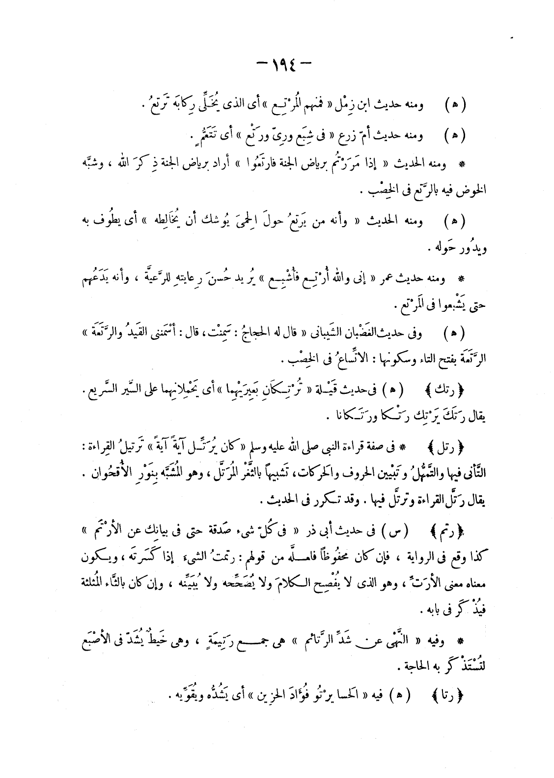 وَمِنْهُ الْحَدِيثُ «إِذَا مَرَرْتُم بِرِيَاضِ الْجَنَّةِ فَارْتَعُوا» أَرَادَ بِرِيَاضِ الْجَنَّةِ ذِكرَ اللَّهِ، وشبَّه الْخَوْضَ فِيهِ بالرَّتع فِي الخِصْب.
