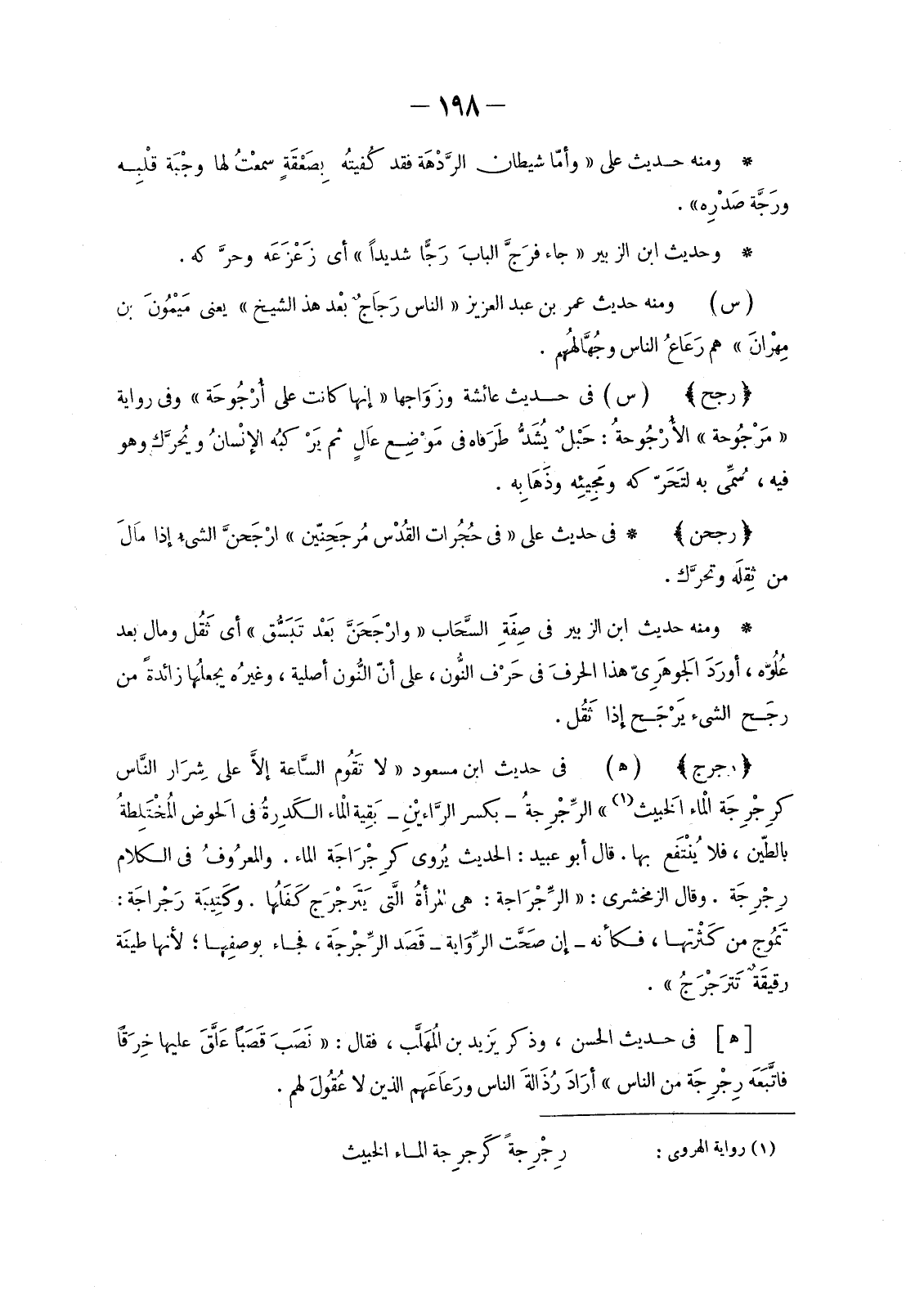 وَمِنْهُ حَدِيثُ ابْنِ الزُّبَيْرِ فِي صِفَةِ السَّحَاب «وارْجَحَنَّ بَعْد تَبَسُّق» أَيْ ثَقُل وَمَالَ بَعْدَ عُلُوّه، أورَدَ الجوهَرِيّ هَذَا الحرفَ فِي حَرْف النُّون، عَلَى أَنَّ النُّون أَصْلِيَّةٌ، وَغَيْرُهُ يَجْعَلُهَا زَائِدَةً مَنْ رجَح الشَّيْءُ يَرْجَح إِذَا ثَقل.