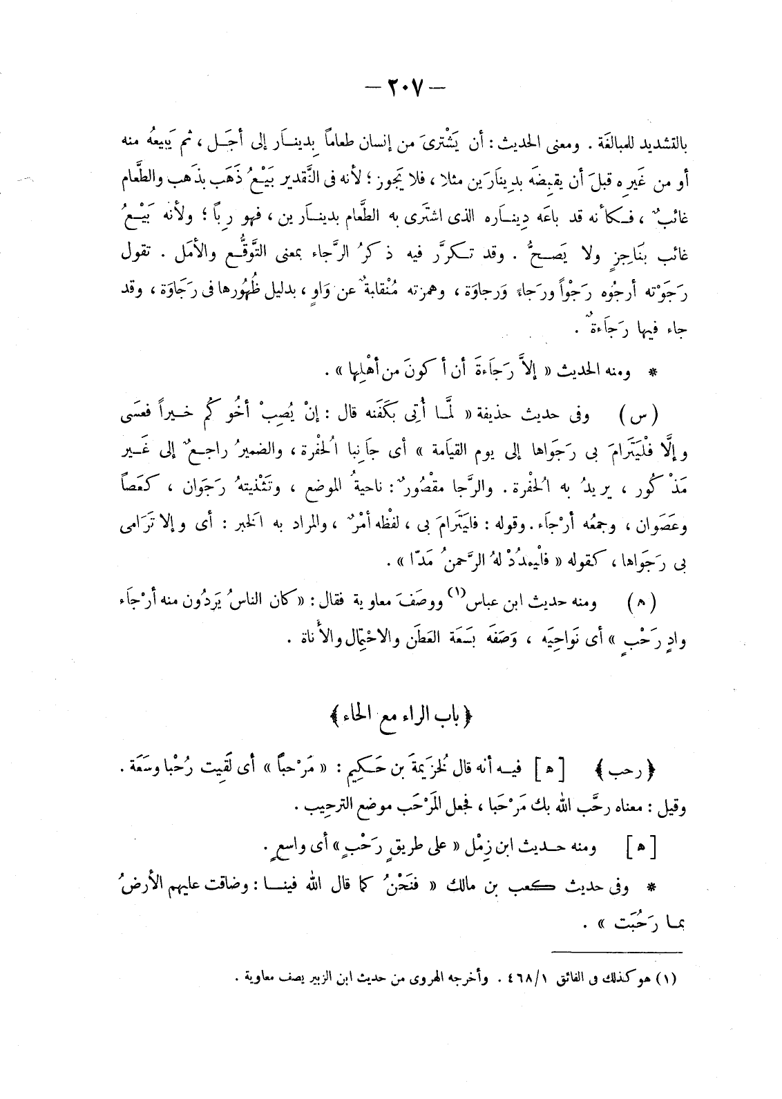 بِالتَّشْدِيدِ للمبالغَة. وَمَعْنَى الْحَدِيثِ: أَنْ يَشْتريَ مِنْ إِنْسَانٍ طَعَامًا بِديناَر إِلَى أجَل، ثُمَّ يَبيعُه مِنْهُ أَوْ مِنْ غَيرِه قبلَ أَنْ يقبِضَه بدِيناَرَين مَثَلًا، فَلَا يَجوز؛ لِأَنَّهُ فِي التَّقدير بَيْعُ ذَهَب بذَهب والطَّعام غائبٌ، فَكَأَنَّهُ قَدْ باعَه دِيناره الَّذِي اشْتَرَى بِهِ الطَّعام بِدِينَارَيْنِ، فَهُوَ رِبًا؛ وَلِأَنَّهُ بَيْعُ غَائِبٍ بنَاجزٍ وَلَا يَصحُّ. وَقَدْ تكرَّر فِيهِ ذكرُ الرَّجَاء بِمَعْنَى التَّوقُّع وَالْأَمَلِ. تَقُولُ رَجَوْته أَرْجُوهُ رَجْوًا وَرَجَاءً وَرجاوَة، وَهَمْزَتُهُ مُنْقلبة عَنْ وَاوٍ، بِدَلِيلِ ظُهُورها فِي رَجَاوَة، وَقَدْ جَاءَ فِيهَا رَجَاءَةٌ.