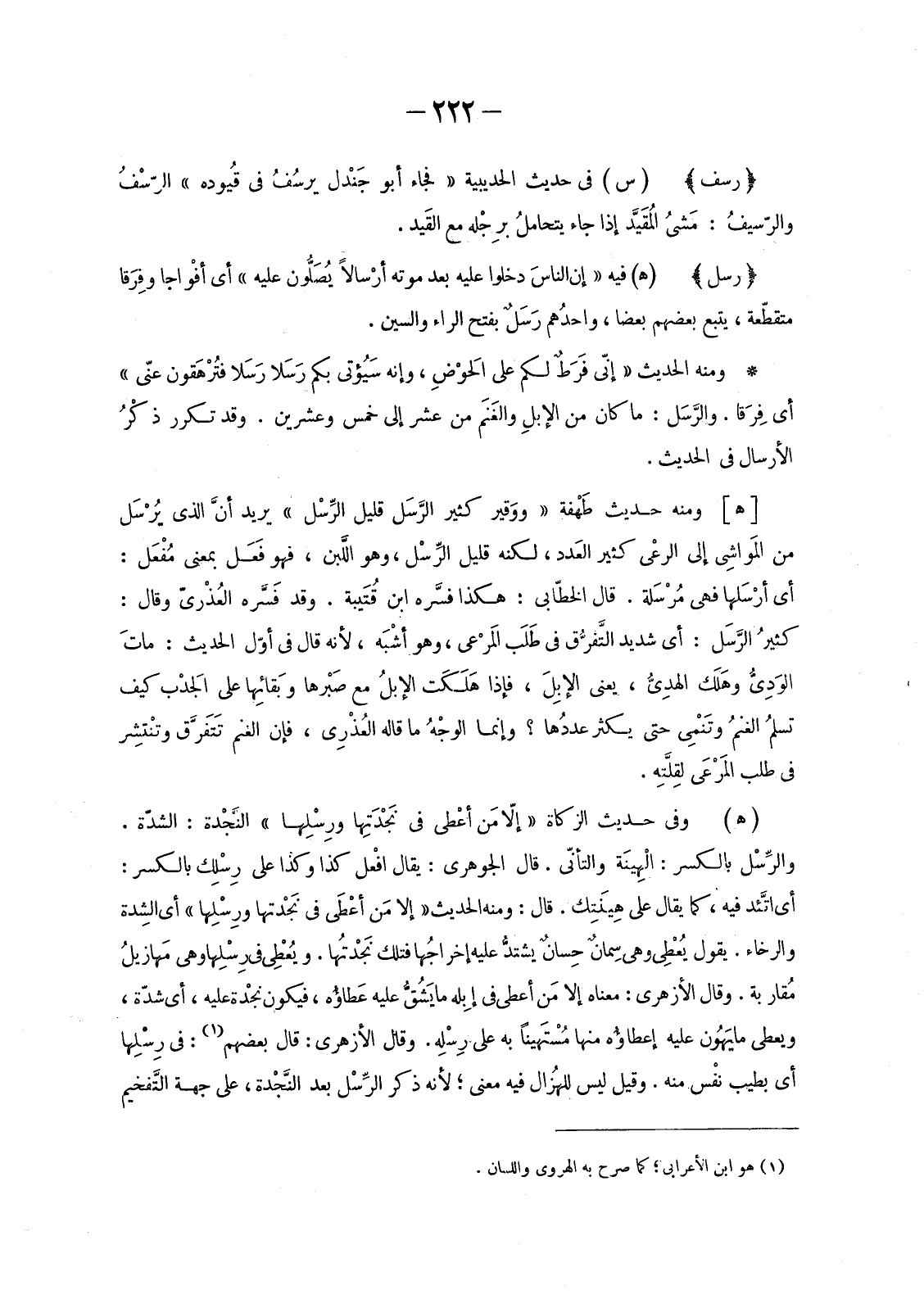 كثيرُ الرَّسَلِ: أَيْ شَدِيدُ التَّفرُّق فِي طَلَب المَرْعى، وَهُوَ أشْبَه، لِأَنَّهُ قَالَ فِي أَوَّلِ الْحَدِيثِ: ماتَ الوَدِيُّ وهَلَك الهدِيُّ، يَعْنِي الإبِلَ، فَإِذَا هَلَكَت الإبلُ مَعَ صَبْرها وبَقائِها عَلَى الجَدْب كَيْفَ تسلُم الغنمُ وتَنْمِي حَتَّى يَكْثُرَ عددُها؟ وَإِنَّمَا الوجْهُ مَا قَالَهُ العُذْرِي، فَإِنَّ الْغَنَمَ تَتَفرَّق وتنْتشِر فِي طَلَبِ المَرْعَى لِقلَّتِه.