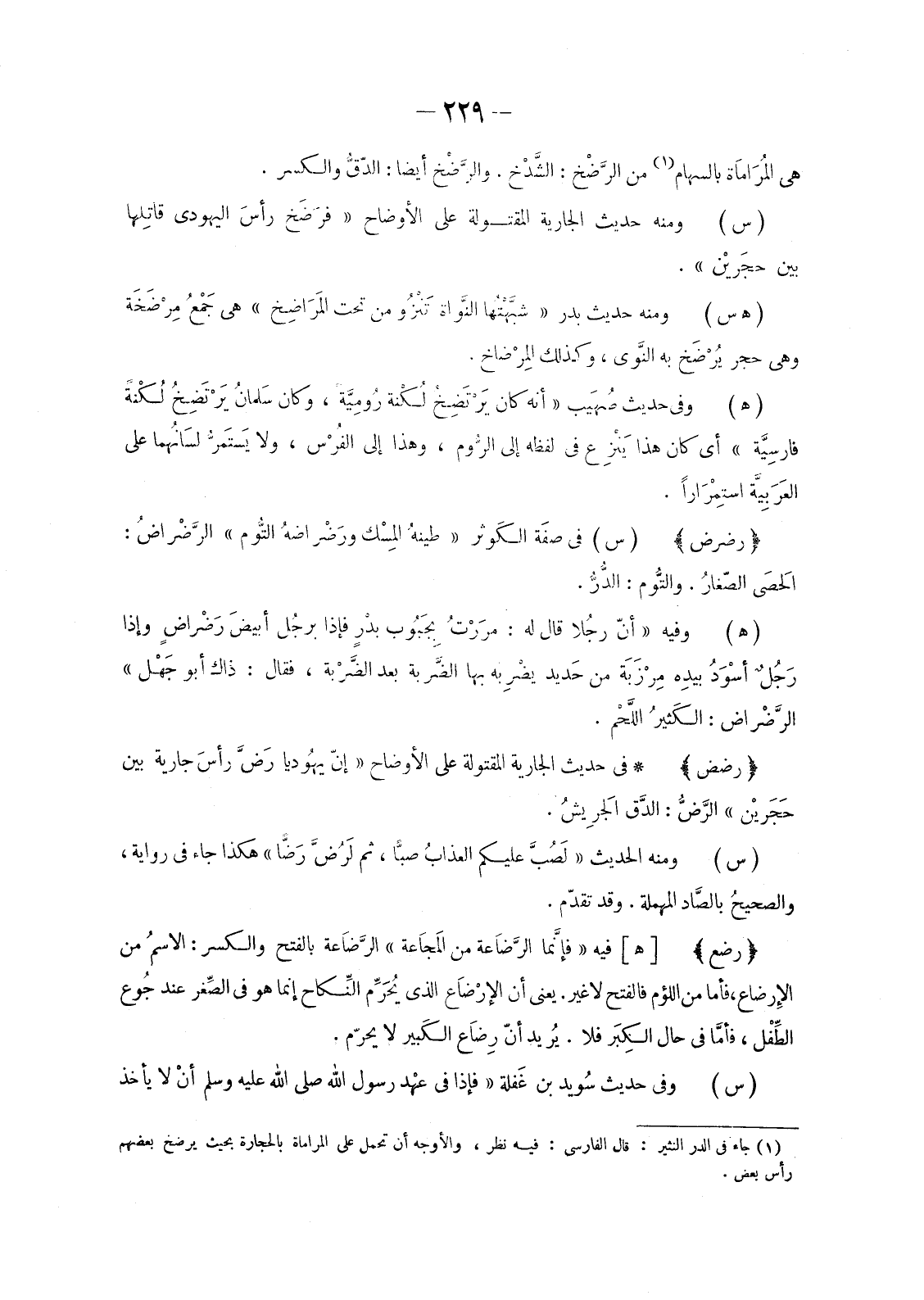 (هـ) وَفِيهِ «أَنَّ رجُلا قَالَ لَهُ: مرَرْتُ بِجَبُوب بدْرٍ فَإِذَا برجُل أبيضَ رَضْرَاضٍ وَإِذَا رَجُلٌ أسْوَدُ بِيَدِهِ مِرْزَبَةٌ مِنْ حَدِيدٍ يَضْرِبُهُ بِهَا الضَّرْبَةَ بَعْدَ الضَّرْبة، فَقَالَ: ذَاكَ أَبُو جَهْل» الرَّضْرَاضُ: الكَثيرُ اللَّحْم.