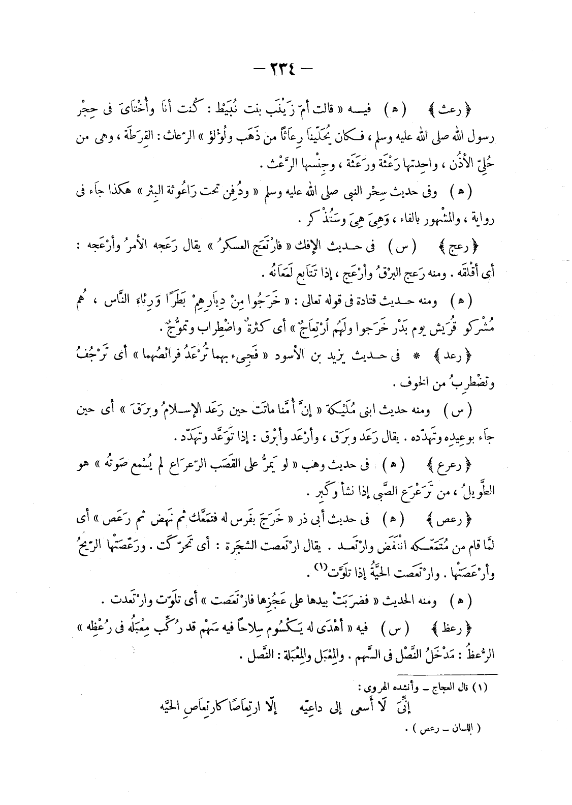 (هـ) فِيهِ «قَالَتْ أُمُّ زَيْنَب بِنْتُ نُبَيْط: كُنت أنَا وأُخْتَايَ فِي حِجْر رَسُولِ اللَّهِ صَلَّى اللَّهُ عَلَيْهِ وَسَلَّمَ، فَكَانَ يُحَلّينَا رِعَاثاً مِنْ ذَهَبٍ ولُؤْلؤ» الرِّعَاثُ: القِرَطَة، وَهِيَ مِنْ حُلِيّ الأذُن، واحِدتها رَعْثَةٌ ورَعَثَةٌ، وجِنْسها الرَّعْثُ.