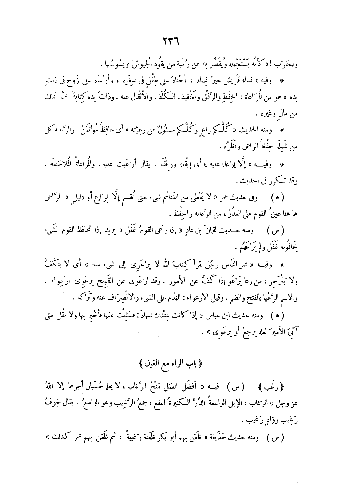 وَفِيهِ «نساءُ قُريش خيرُ نِساءٍ، أحْناهُ عَلَى طِفْلٍ فِي صِغَره، وأَرْعَاهُ عَلَى زَوج فِي ذاتِ يَدِهِ» هُوَ مِنَ الْمُرَاعَاةِ: الحِفْظِ والرِّفْق وتَخْفيف الكُلَف والأثْقال عَنْهُ. وذاتُ يَدِهِ كِنايةٌ عمَّا يَملك مِنْ مالٍ وَغَيْرِهِ.