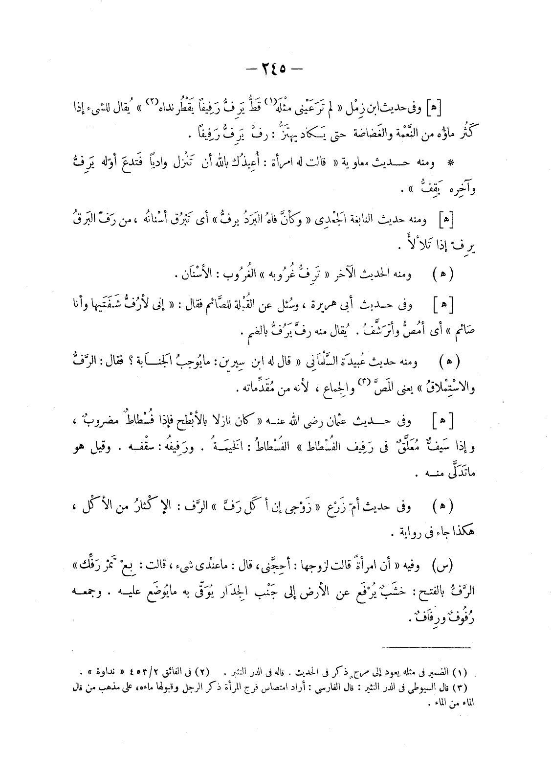 [هـ] وَفِي حَدِيثِ ابْنِ زِمْلٍ «لَمْ تَرَ عَيْنِي مثْلَه «1» قَطُّ يَرِفُّ رَفِيفاً يَقْطُر نَدَاهُ «2» » يُقال لِلشَّيْءِ إِذَا كَثُر ماؤُه مِنَ النَّعْمة والغَضاضة حَتَّى يَكاد يهَتُّز: رَفَّ يَرِفُّ رَفِيفاً.