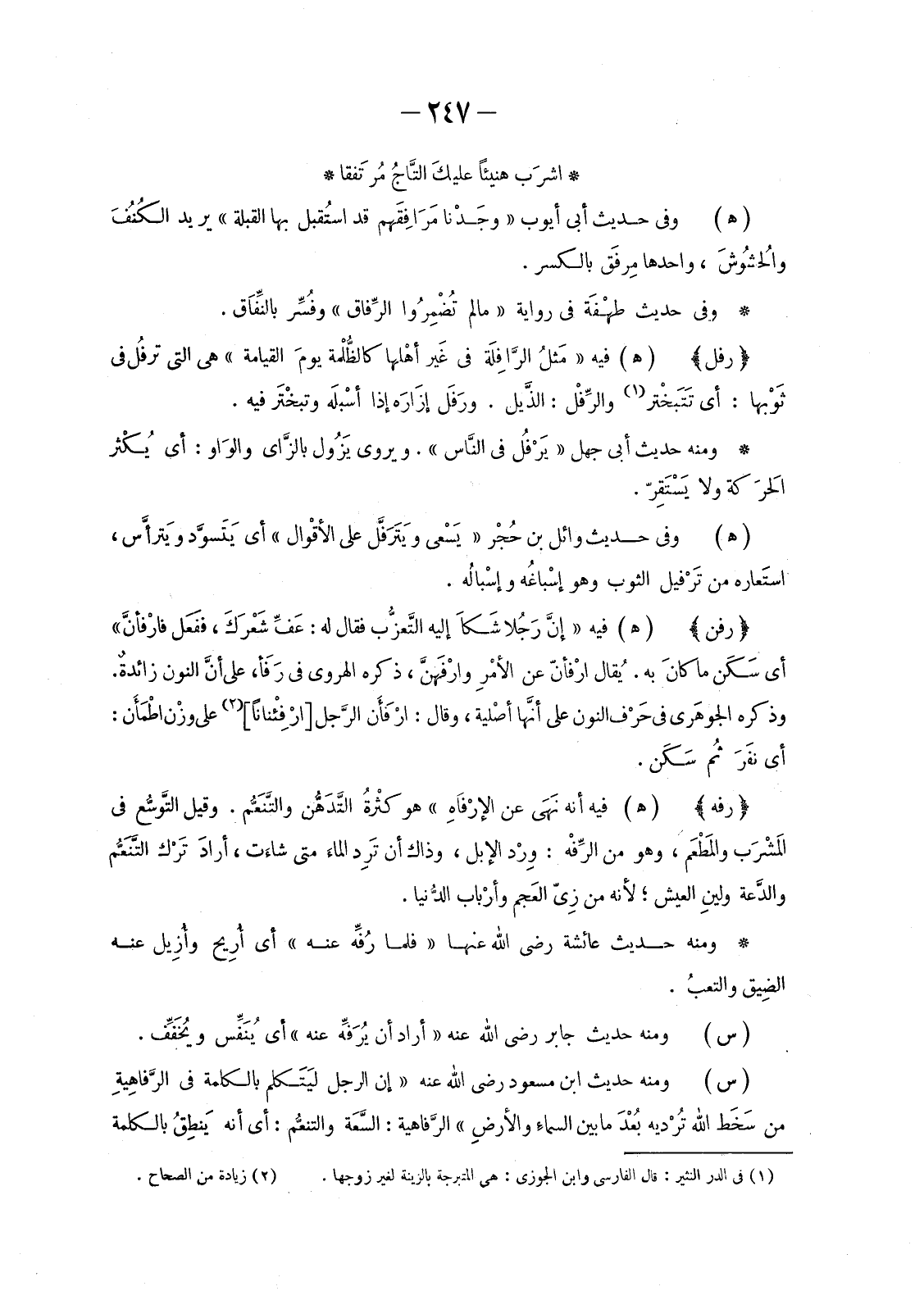اشرَب هَنِيئًا عليكَ التَّاجُ مُرْتَفِقاً (هـ) وَفِي حَدِيثِ أَبِي أَيُّوبَ «وجَدْنا مَرَافِقَهُمْ قَدِ اسُتقبل بِهَا الْقِبْلَةُ» يُرِيدُ الكُنُفَ والحُشُوشَ، وَاحِدُهَا مِرْفَقٌ بِالْكَسْرِ.