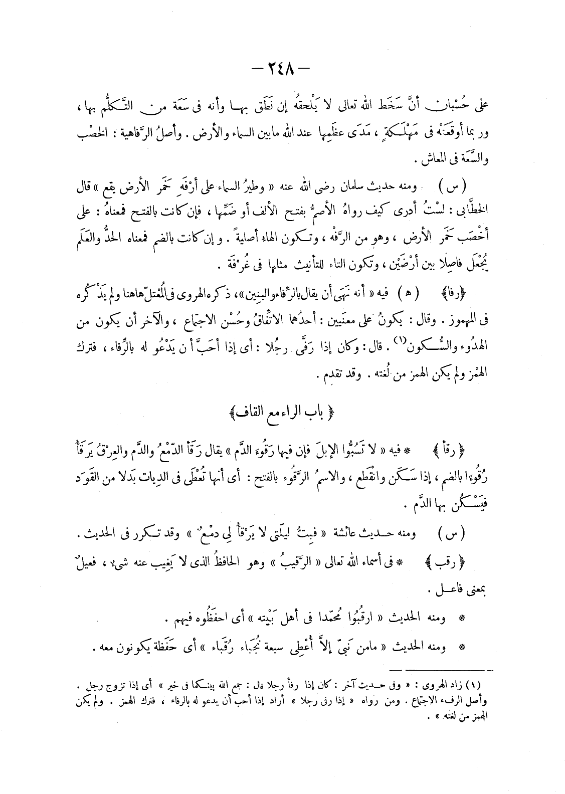 (1) زاد الهروي: «وفي حديث آخر: كان إذا رفأ رجلا قال: جمع الله بينكما في خير» أي إذا تزوج رجل. وأصل الرفء الاجتماع. ومن رواه «إذا رفى رجلا» أراد إِذَا أَحَبَّ أَنْ يَدْعُوَ لَهُ بِالرِّفَاءِ، فَتَرَكَ الهمز. ولم يكن الهمز من لغته» .