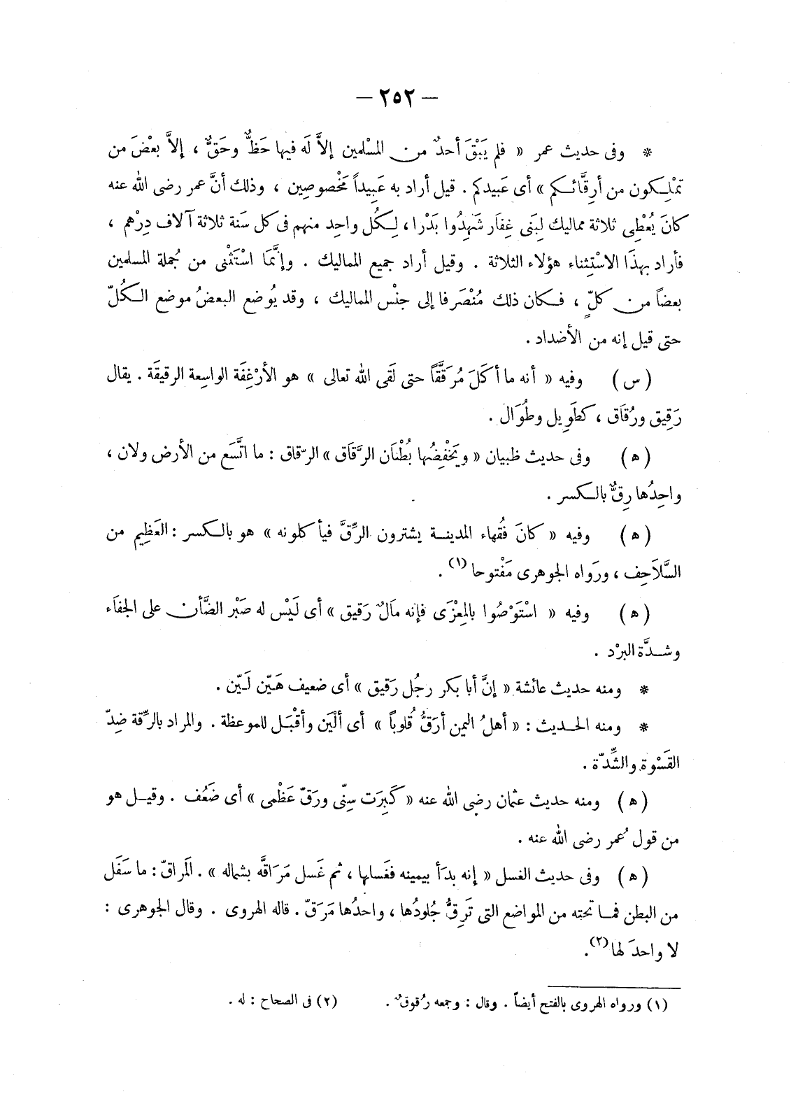 وَفِي حَدِيثِ عُمَرَ «فَلَمْ يَبْقَ أحدٌ مِنَ المسْلمين إلَّا لَه فِيهَا حَظٌّ وحَقٌّ، إلَّا بعْضَ مَنْ تمْلِكون مِنْ أَرِقَّائِكُمْ» أَيْ عَبيدكم. قِيلَ أَرَادَ بِهِ عَبيداً مَخْصوصِين، وَذَلِكَ أنَّ عُمَرَ رَضِيَ اللَّهُ عَنْهُ كانَ يُعْطِي ثَلَاثَةَ مَمَالِيكَ لبَنِي غِفَار شَهِدُوا بَدْرا، لِكُل واحِد مِنْهُمْ فِي كُلِّ سَنة ثَلَاثَةَ آلَافِ دِرْهم، فَأَرَادَ بهذَا الاسْتِثناء هَؤُلَاءِ الثَّلَاثَةَ. وَقِيلَ أَرَادَ جَمِيعَ الْمَمَالِيكِ. وإنَّمَا اسْتَثنى مِنْ جُملة الْمُسْلِمِينَ بَعْضًا مِنْ كلٍّ، فَكَانَ ذَلِكَ مُنْصَرفا إِلَى جِنْسِ الْمَمَالِيكِ، وَقَدْ يُوضَعُ الْبَعْضُ مَوْضِعَ الكُلّ حَتَّى قِيلَ إِنَّهُ مِنَ الْأَضْدَادِ.