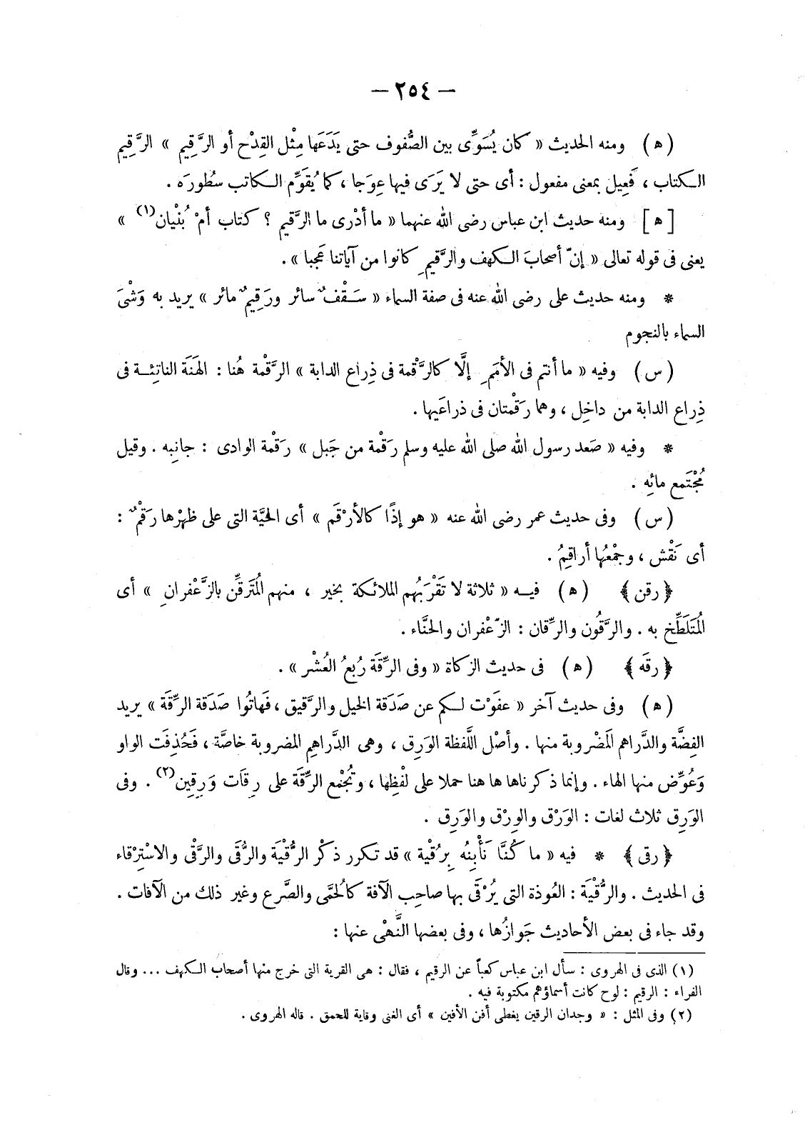 وَمِنْهُ حَدِيثُ عَلِيٍّ رَضِيَ اللَّهُ عَنْهُ فِي صِفَةِ السَّمَاءِ «سَقْفٌ سَائِرٌ ورَقِيمٌ مَائِرٌ» يُرِيدُ بِهِ وَشْيَ السَّمَاءِ بِالنُّجُومِ (س) وَفِيهِ «مَا أَنْتُمْ فِي الأمَمِ إِلَّا كَالرَّقْمَةِ فِي ذِراع الدَّابَّةِ» الرَّقْمَةُ هُنا: الهَنَة الناتِئة فِي ذِراع الدابة من داخِل، وهما رَقْمَتَانِ في ذراعَيها.