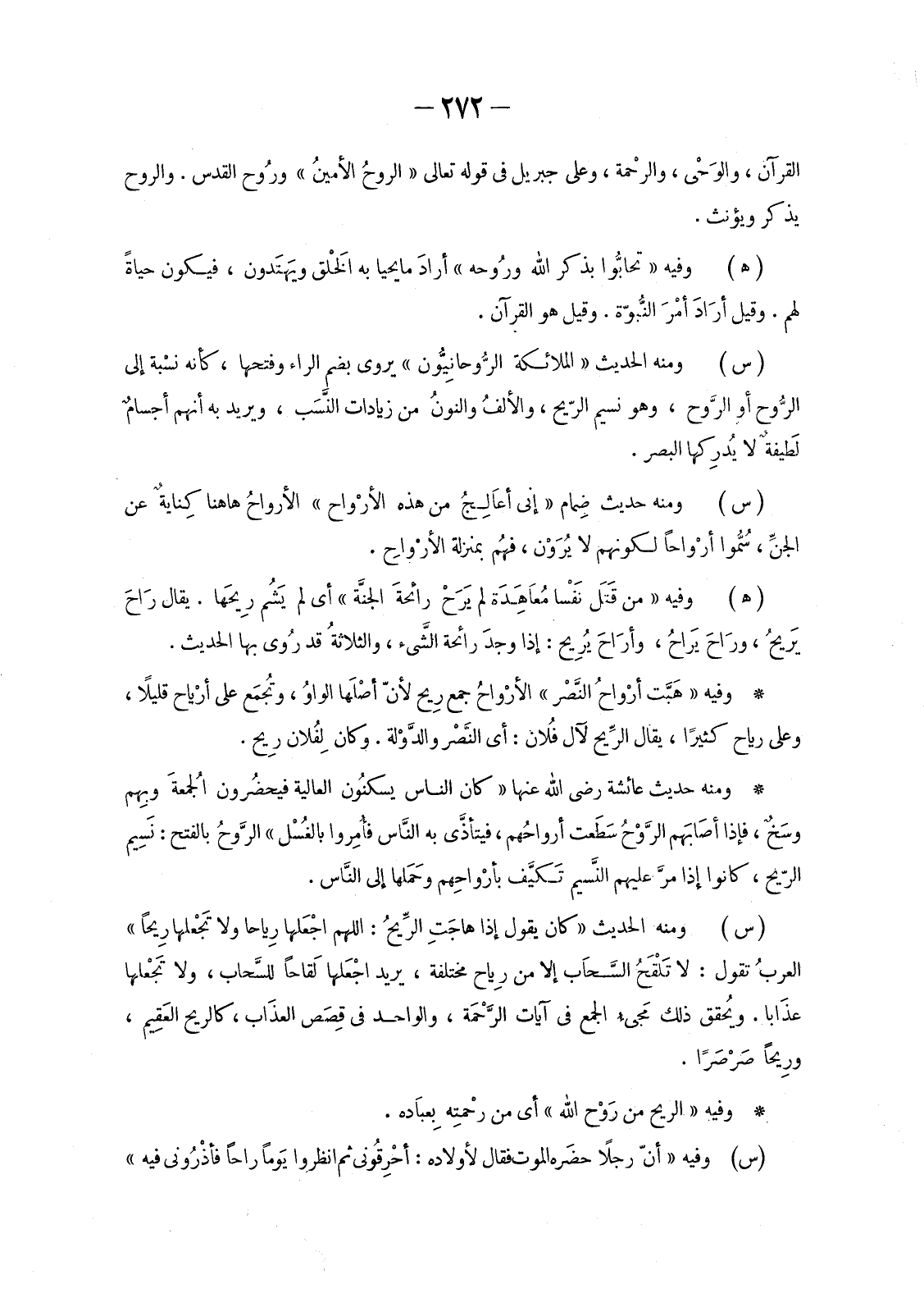 وَفِيهِ «هَبَّت أَرْوَاحُ النَّصْر» الْأَرْوَاحُ جَمْعُ رِيحٍ لِأَنَّ أصْلَها الواوُ، وتُجمَع عَلَى أَرْيَاحٍ قَلِيلًا، وَعَلَى رِيَاحٍ كَثِيرًا، يُقَالُ الرِّيحُ لِآلِ فُلان: أَيِ النَّصر والدَّوْلة. وَكَانَ لِفُلان رِيح.