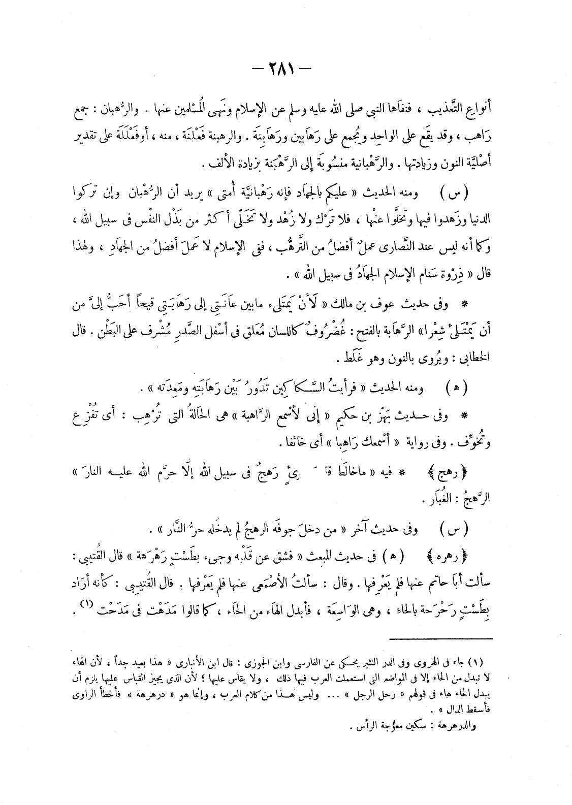 (1) جاء في الهروي وفي الدر النثير يحكى عن الفارسي وابن الجوزي: قال ابن الأنباري «هذا بعيد جداً، لأن الهاء لا تبدل من الحاء إلا في المواضع التي استعملت العرب فيها ذلك، ولا يقاس عليها؛ لأن الذي يجيز القياس عليها يلزم أن يبدل الحاء هاء في قولهم «رحل الرجل» .... وليس هذا من كلام العرب، وإنما هو «درهرهة» فأخطأ الراوى فأسقط الدال» . والدرهرهة: سكين معوجة الرأس.