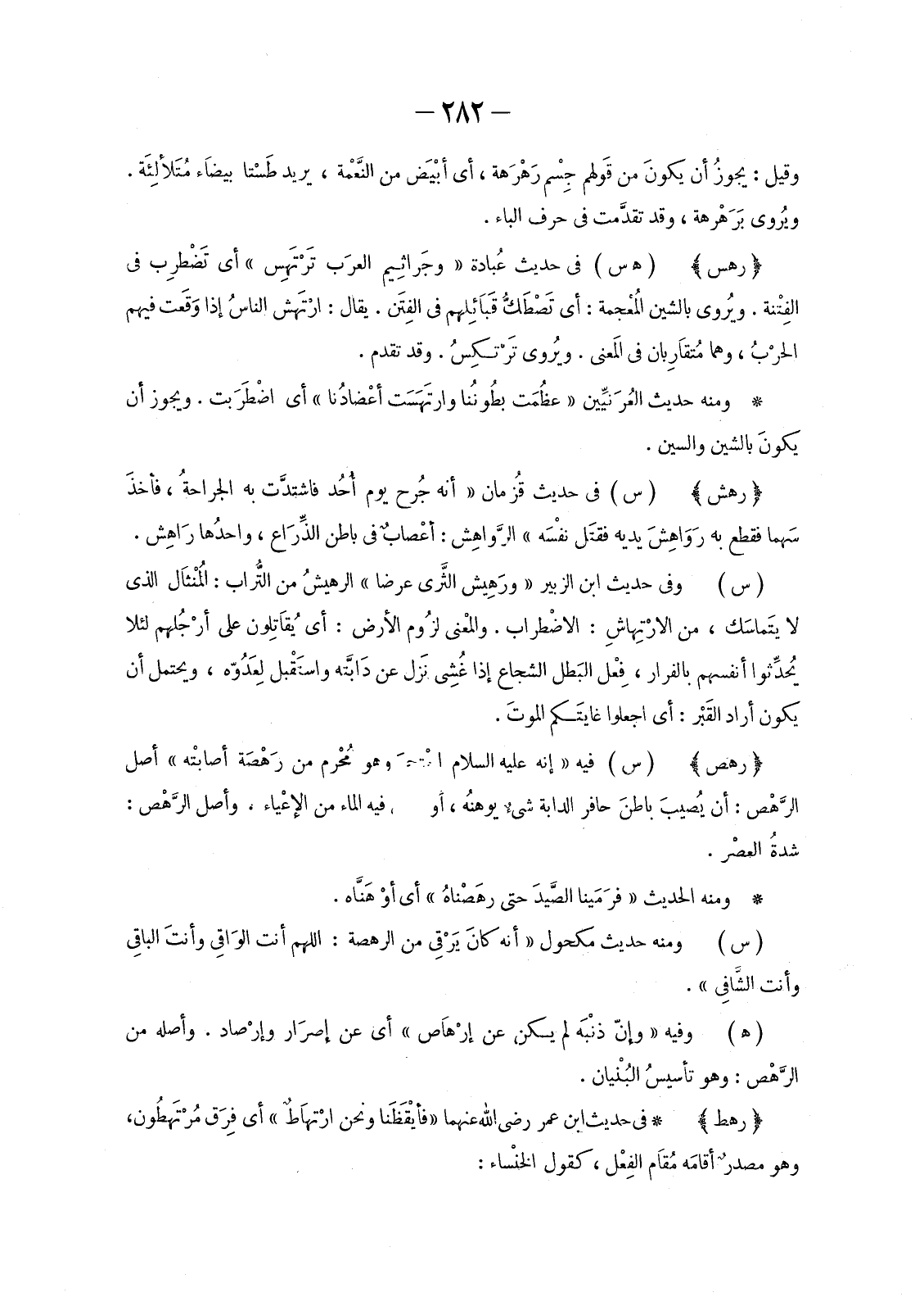 وَمِنْهُ حَدِيثُ العُرَنِّيين «عظُمَت بطُونُنا وارْتَهَسَتْ أعْضادُنا» أَيِ اضْطَرَبت. وَيَجُوزُ أَنْ يكونَ بِالشِّينِ وَالسِّينِ.