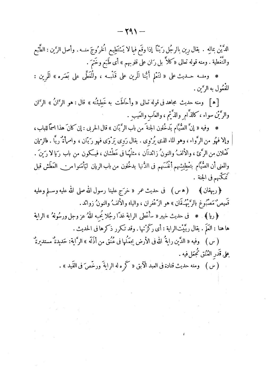 وَفِيهِ «إنَّ الصُّيَّام يَدخُلون الجنةَ مِنْ بَابِ الرَّيّان» قَالَ الْحَرْبِيُّ: إِنْ كانَ هَذَا اسْمًا لِلْبَابِ، وَإِلَّا فهُو مِنَ الرَّواء، وَهُوَ الْمَاءُ الَّذِي يُرْوِى. يُقَالُ رَوِى يَرْوَى فَهُوَ رَيّان، وامرأةٌ ريَّا. فَالرَّيَّانُ فَعْلان مِنَ الرَّيّ، والألفُ والنونُ زائدتاَن، مثلْهُما فِي عَطْشان، فَيَكُونُ مِنْ بَابِ رَيا لَا رَينَ.